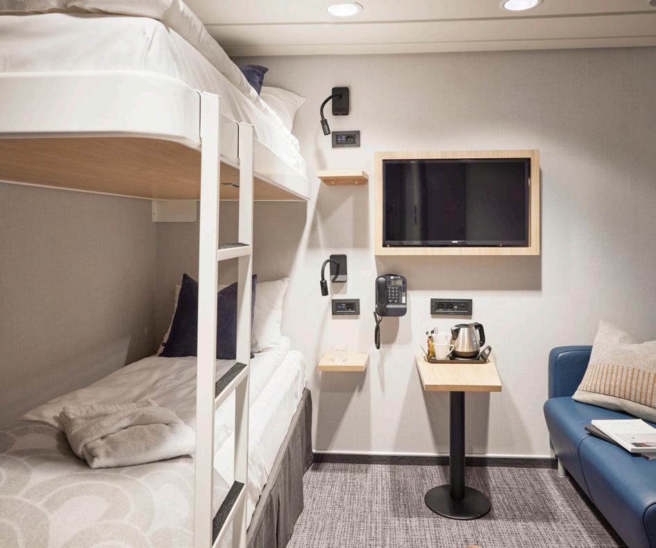 Interior cabins provide comfortable, affordable alternative with upper and lower beds. Interior Accessible cabins have two or four beds and are more spacious to accommodate wheelchairs with larger bathrooms.