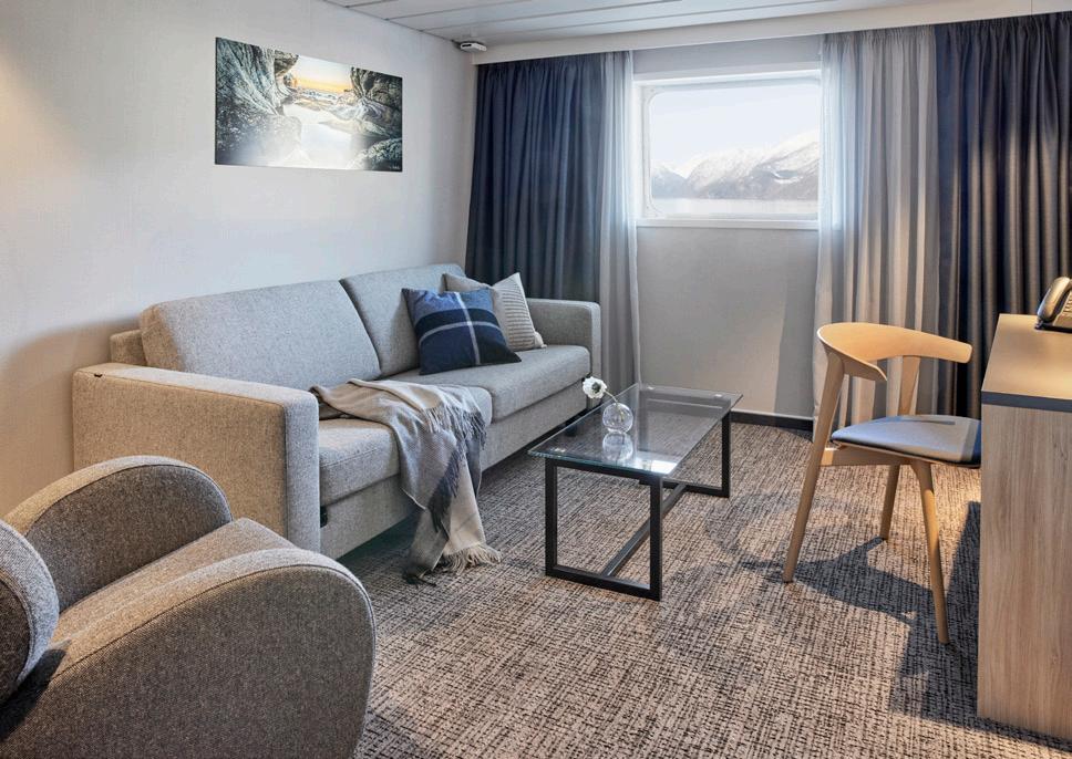 The cabin also includes a welcome pack, bathrobe and slippers, hairdryer and coffee machine. The junior suites include the Havila Gold package.