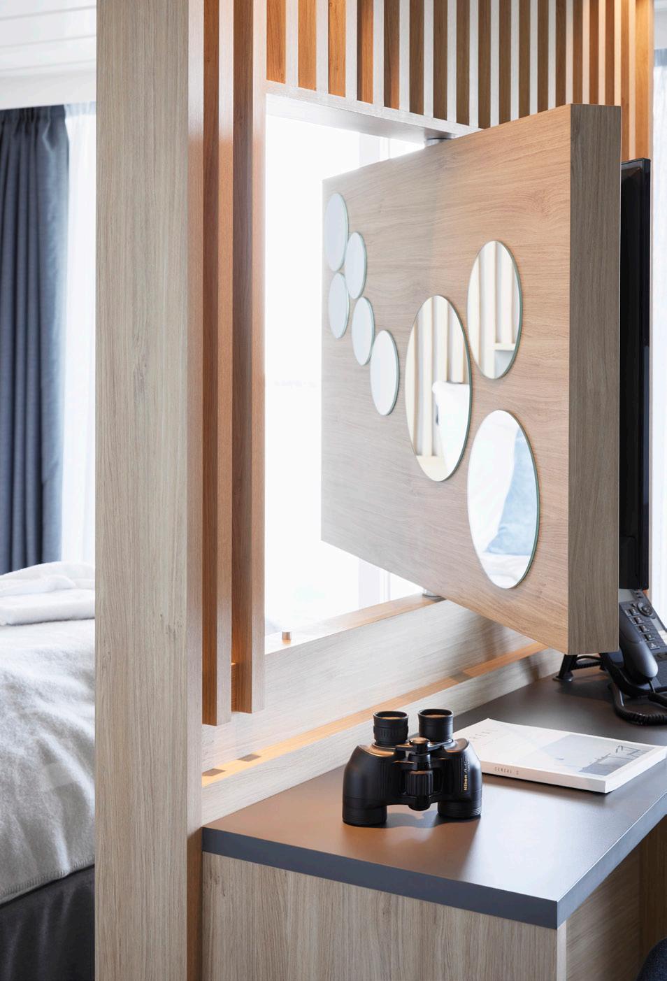 The Junior Suite is divided by a TV wall. This can be swivelled between the seating area and the bed, so you can choose where you want to watch TV, as an alternative to the view through the large windows in your cabin.