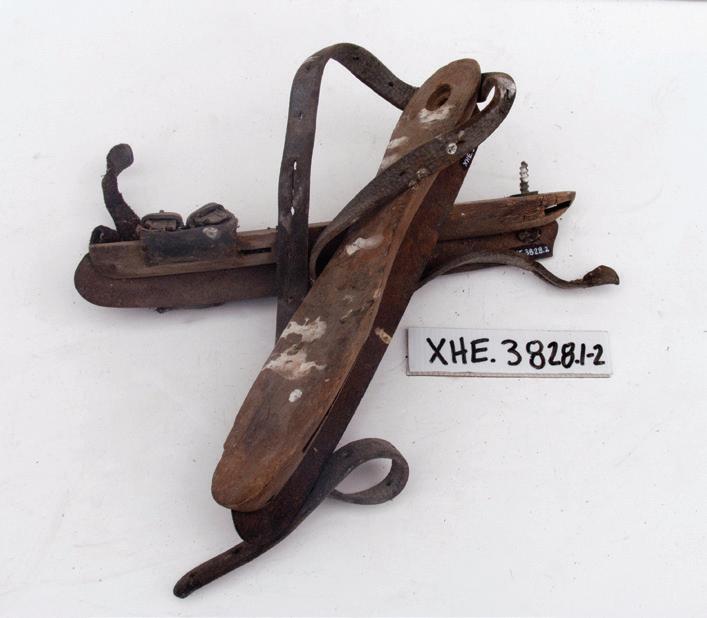Made to attach to boots, and consisting of wooden base plates with leather straps and steel skate blades, this pair of homemade skates is a well-loved collections item housed at Hayes Engineering Works in Oturehua.