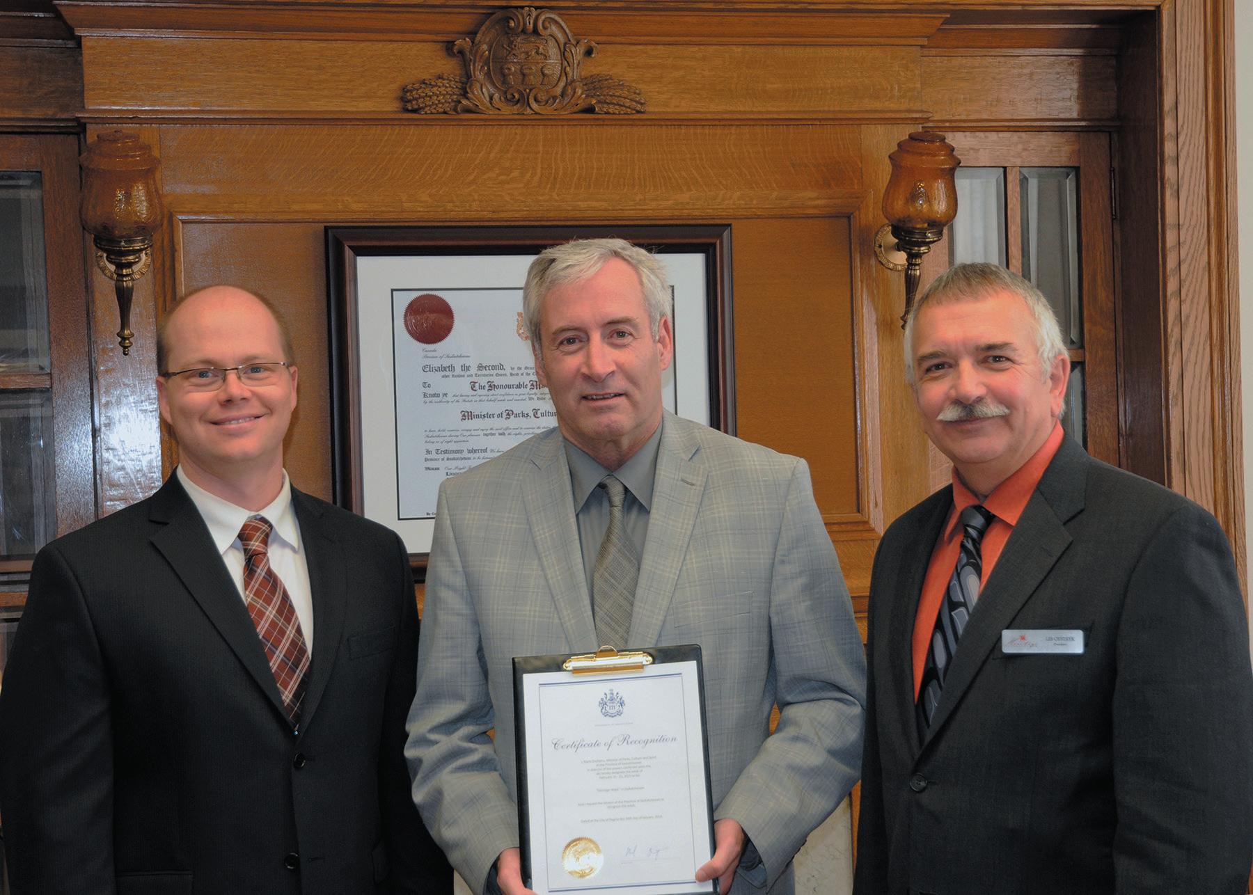 From left to right: Brad Taylor, Director, Saskatchewan Heritage Foundation, Minister Mark Docherty, and Les Oystryk, President of Heritage Saskatchewan