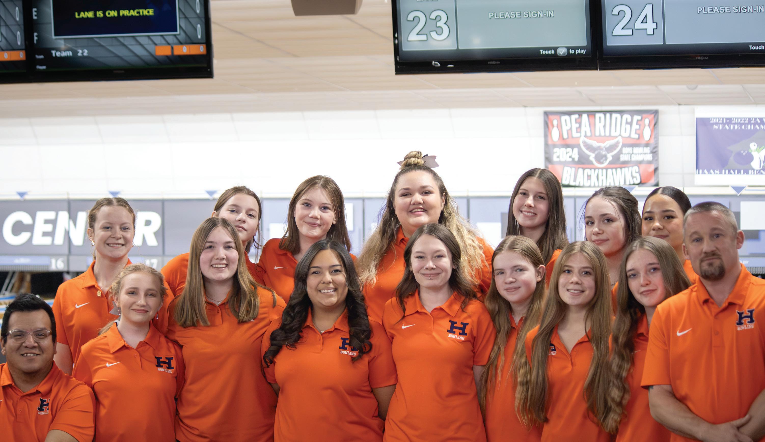 Girls bowling poses for a photo on their last home game of the season, which was also their senior night. The girls won the game against Springdale by 796 pins.