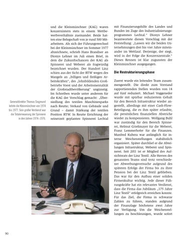 Die Restrukturierungsphase Zuerst wurde ein leitendes Team zusammengestellt. Die direkt zum Vorstand rapportierenden Stellen wurden von 14 auf fünf reduziert. Michael Voggeneder wurde mit spürbar reduziertem Gehalt für den Bereich Infrastruktur wieder angestellt, allerdings mit einer Cash-FlowBeteiligung, die es ihm später erlaubte, die persönlichen finanziellen Abstriche wieder zu kompensieren. Wolfgang Buhl war zuständig für den Bereich Spinnerei, Helmut Grießmayer für die Weberei, Franz Lemmerhofer für die Finanzen. Manfred Kubera war anfänglich für interne Weichenstellungen stabähnlich organisiert. Später durchlief er die Abteilungen Infrastruktur, Weberei und Spinnerei. Seit 2011 ist er Mitglied des Aufsichtsrats der Linz Textil. Alle Herren des genannten Teams sind trotz verschiedener Abwerbungsversuche aufgrund des späteren Erfolgs der Firma bis zu ihrer Pension bei der Linz Textil geblieben. Das war für den Aufbau einer soliden Firmenkultur wichtig. Jede dieser Führungskräfte hat ein relevantes Verdienst, dass die Firma das Jubiläum „175 Jahre Linz Textil“ erfolgreich erreichen konnte. Für das Ziel, die Firma in schwarze Zahlen zu führen, standen aufgrund der Finanzlage höchstens zwei Jahre zur Verfügung. Um die Weichenstellungen zu beschleunigen, wurde sofort