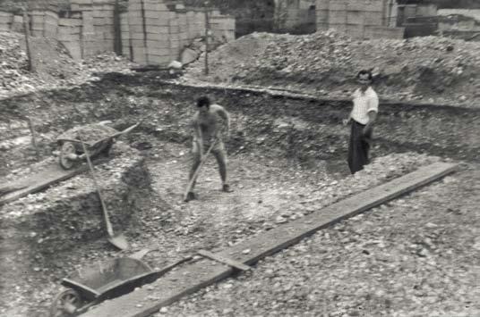 Oben: Im Vordergrund sind die Häuser an der Hörschingerstraße zu sehen, wo sich auch das ehemalige Chirurgenhaus Pasching Nr. 66 befindet, die Besitzerin war damals Josefa Granner. Gegenüber stehen die Häuser Hu mer (90), die Ertl Villa (80), Stockinger (74), Öfferlbauer (73) und gegenüber befindet sich die Tankstelle Pühringer (134). Dahinter liegen die Bauernhöfe Baumgartner (53), Schreiner (10), Baunbauer (50) und Sigl (47). Rechts oben in der Dörnbacherstraße stehen das Haus Nr. 99 (Kellermayr, Just) und das Haus Nr. 48 (Siglhäusl). Oben an der Schulstraße sind die Häuser Burgstaller (55), Pruscha (54), Wöhrer (56) und Nöbau er (69) sowie an der Baumgartnerstraße die Häuser Starrermayr (52) und Aigner (51).