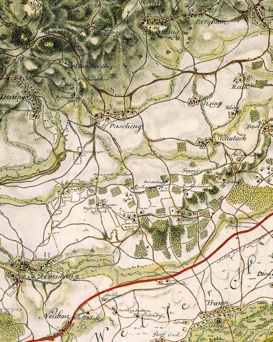 Der Postverkehr war zunächst eine Frage der Infra struktur: Als Kaiser Maximilian I. gegen Ende des 15. Jahrhunderts eine erste Reiterpost einrichtete, war eine der deklarierten Poststraßen im Land die heutige Bundesstraße an der Grenze zwischen den Gemeinden Traun und Pasching. Damals war das Postrecht noch an private Personen vergeben, erst Kaiser Karl VI. erklärte 1722 die Post zum Staats monopol. Unter Maria Theresia und Josef II. wurde der reguläre Postreisedienst mit regelmäßig ver kehrenden Postkutschen eingeführt. Die Post be förderte nicht nur Briefe, sondern auch Menschen. Ab 1832 wurde auch die Pferdeeisenbahn, die auch durch Wagram führte, für die Postbeförderung in Anspruch genommen. Mit der Kaiserin-ElisabethBahn und einem bald immer dichter werdenden Bahnnetz auch in Oberösterreich erhielt die Post straße durch die Schiene Konkurrenz. Nachdem am 1. September 1859 der erste Zug auf der heutigen Westbahn an Pasching vorbeifuhr und kurz darauf im Bahnhof Hörsching hielt, wurde dort ein Postamt eingerichtet, entsprechend der Part nerschaft zwischen Post und Bahn. Die Gemeinde Pasching wurde dem Post-Bestellungsbezirk Hör sching zugeteilt. Nur die Ortschaft Wagram, die bis 1881 zur Gemeinde Traun gehörte, blieb auch nach der Eingemeindung nach Pasching weiter beim Be stellungsbezirk Traun. Am 20. Jänner 1899 wurde das k. k. Postamt Hörsching vom Bahnhof in den Ort verlegt, allerdings wurde angeordnet, dass die Beamten viermal am Tag Botengänge zum Hör schinger Bahnhof zu unternehmen haben, um von bestimmten Zügen auf der Strecke zwischen Wien und Salzburg die Post abzuholen bzw. aufzugeben. Damals wurden auch die Gemeinde Pasching und die zur Gemeinde Hörsching gehörende Ortschaft Breitbrunn aus dem Bestellungsbezirk des Postam tes Hörsching ausgeschieden und jenem des näher gelegenen Postamtes Thening zugewiesen. Doch die Paschinger, wie man der Linzer Tages-Post ent nehmen konnte, waren darüber wenig erfreut und wollten lieber ihr eigenes Postamt: „Behufs Verbes serung und Beschleunigung des Zustellungs- und Ein sammlungsdienstes im jenseits der Bahn gelegenen