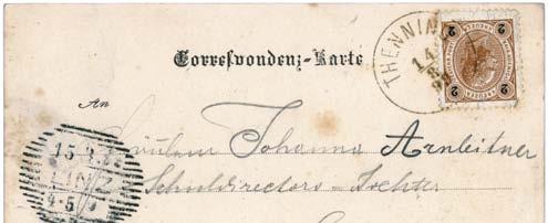 Unten: Korrespondenzkarte aus Pasching, abgestempelt in Thening am 14. August 1899, als Pasching noch zum Bestellungs bezirk des Postamtes Thening gehörte. Die ersten österreichischen Briefmarken kamen 1850 in Umlauf. Der erste Poststempel, der exakte Datums- und Ortsangaben auf den Briefen hinterließ, wurde im Jahr 1867 ein geführt. 1869 wurden die ersten Postkarten oder, wie damals gesagt wurde, „Correspon denz-Karten“ versendet, sie waren eine ös terreichische Erfindung. Die Idee fand großen Zuspruch: Bereits im ersten Monat wurden 1,4 Mio. Stück verkauft. Vielleicht war das mitunter ein Grund, dass zwischen 1869 und 1870 die Zahl der Postämter in Oberöster reich von 148 auf 244 stieg. Auch in Thening entstand damals ein Postamt, wie die Linzer Tages-Post ankündigte: „Am 1. November 1870 wird in Thening ein selbstständiges k. k. Postamt in Wirksamkeit treten, und mit dem Postamte in Hörsching durch tägliche Fußbo tenposten in Verbindung gesetzt werden.“