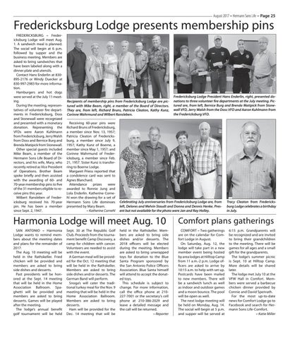 Fredericksburg Lodge presents membership pins FREDERICKSBURG – Fredericksburg Lodge will meet Aug. 1. A sandwich meal is planned. The social will begin at 6 p.m. followed by supper and the business meeting. Members are asked to bring sandwiches that have been labeled along with a dinner plate and utensils. Contact Hans Enderlin at 830895-2176 or Windy Duecker at 830-997-2983 for more information. Hamburgers and hot dogs were served at the July 11 meeting. During the meeting, representatives of volunteer fire departments in Fredericksburg, Doss and Stonewall were recognized and presented with a monetary donation. Representing the VFDs were Aaron Kuhlmann from Fredericksburg, Jerry Walsh from Doss and Bernice Burg and Brenda Matipick from Stonewall. Other special guests included Mike Beam, a member of the Hermann Sons Life Board of Directors, and his wife, Mary, who recently retired as Vice President of Operations. Brother Beam spoke briefly and then assisted with the awarding of 60- and 70-year membership pins to five of the 31 members eligible to receive pins this year. Wilbert Ransleben of Fredericksburg received his 70-year pin. He has been a member since Sept. 2, 1947.