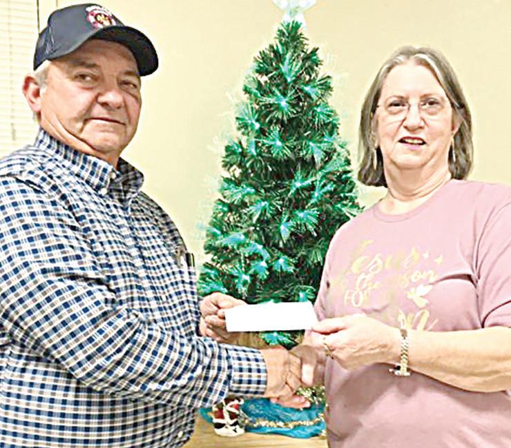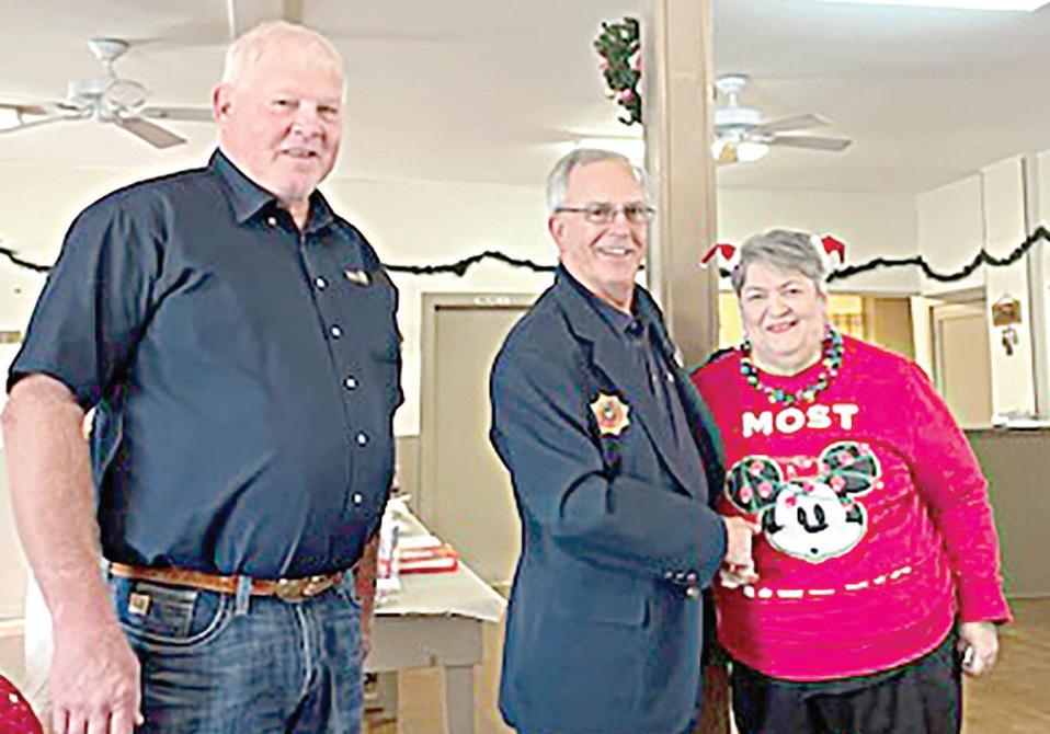 Jay Fojtik, fire chief for the Jourdanton Volunteer Fire Department, accepts a $760 donation from Jourdanton Lodge President Valerie Craig during the lodge’s Christmas party.