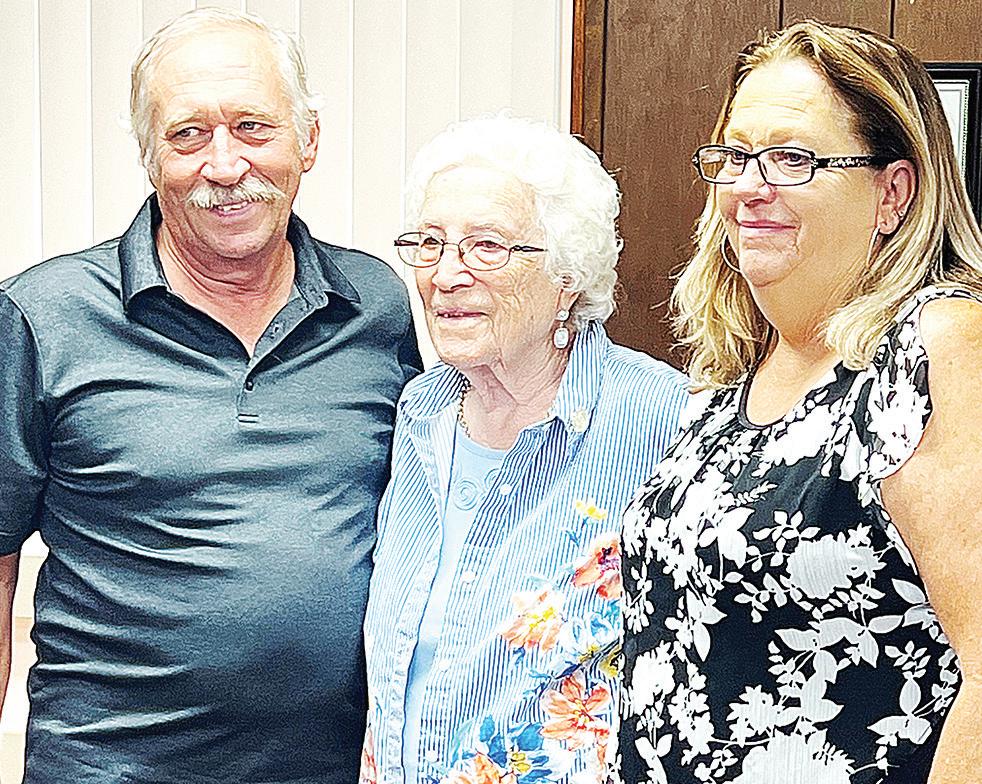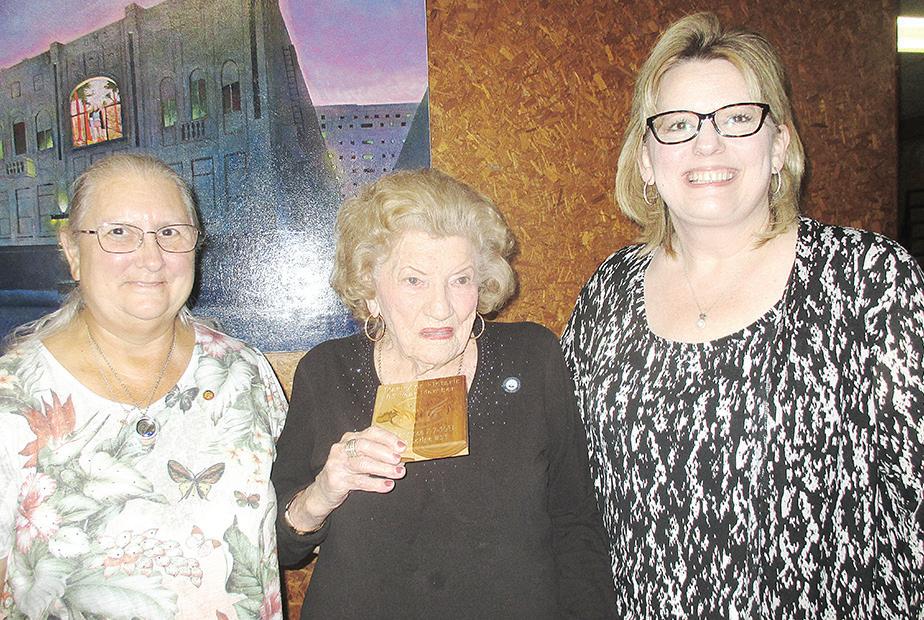 Vineta Lodge member Mary Ann Pintaric, 102, center, was presented with a plaque for 85-years of membership at the September meeting. Presenting the plaque were President Debbie Jordan, left, and President and CEO Robin Czarnek. Mary Ann has been a member since July