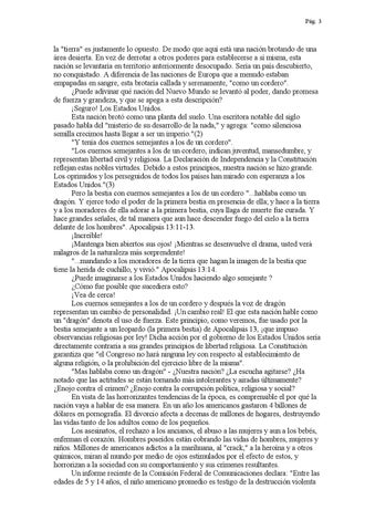 la "tierra" es justamente lo opuesto. De modo que aquí está una nación brotando de una área desierta. En vez de derrotar a otros poderes para establecerse a sí misma, esta nación se levantaría en territorio anteriormente desocupado. Sería un país descubierto, no conquistado. A diferencia de las naciones de Europa que a menudo estaban empapadas en sangre, esta brotaría callada y serenamente, "como un cordero". ¿Puede adivinar qué nación del Nuevo Mundo se levantó al poder, dando promesa de fuerza y grandeza, y que se apega a esta descripción? ¡Seguro! Los Estados Unidos. Esta nación brotó como una planta del suelo. Una escritora notable del siglo pasado habla del "misterio de su desarrollo de la nada," y agrega: "como silenciosa semilla crecimos hasta llegar a ser un imperio."(2) "Y tenía dos cuernos semejantes a los de un cordero". "Los cuernos semejantes a los de un cordero, indican juventud, mansedumbre, y representan libertad civil y religiosa. La Declaración de Independencia y la Constitución reflejan estas nobles virtudes. Debido a estos principios, nuestra nación se hizo grande. Los oprimidos y los perseguidos de todos los países han mirado con esperanza a los Estados Unidos."(3) Pero la bestia con cuernos semejantes a los de un cordero "...hablaba como un dragón. Y ejerce todo el poder de la primera bestia en presencia de ella; y hace a la tierra y a los moradores de ella adorar a la primera bestia, cuya llaga de muerte fue curada. Y hace grandes señales, de tal manera que aun hace descender fuego del cielo a la tierra delante de los hombres". Apocalipsis 13:11-13. ¡Increíble! ¡Mantenga bien abiertos sus ojos! ¡Mientras se desenvuelve el drama, usted verá milagros de la naturaleza más sorprendente! "...mandando a los moradores de la tierra que hagan la imagen de la bestia que tiene la herida de cuchillo, y vivió." Apocalipsis 13:14. ¿Puede imaginarse a los Estados Unidos haciendo algo semejante ? ¿Cómo fue posible que sucediera esto? ¡Vea de cerca! Los cuernos semejantes a los de un cordero y después la voz de dragón representan un cambio de personalidad. ¡Un cambio real! El que esta nación hable como un "dragón" denota el uso de fuerza. Este principio, como veremos, fue usado por la bestia semejante a un leopardo (la primera bestia) de Apocalipsis 13, ¡que impuso observancias religiosas por ley! Dicha acción por el gobierno de los Estados Unidos sería directamente contraria a sus grandes principios de libertad religiosa. La Constitución garantiza que "el Congreso no hará ninguna ley con respecto al establecimiento de alguna religión, o la prohibición del ejercicio libre de la misma". "Mas hablaba como un dragón" - ¿Nuestra nación? ¿La escucha agitarse? ¿Ha notado que las actitudes se están tornando más intolerantes y airadas últimamente? ¿Enojo contra el crimen? ¿Enojo contra la corrupción política, religiosa y social? En vista de las horrorizantes tendencias de la época, es comprensible el por qué la nación vaya a hablar de esa manera. En un año los americanos gastaron 4 billones de dólares en pornografía. El divorcio afecta a decenas de millones de hogares, destruyendo las vidas tanto de los adultos como de los pequeños. Los asesinatos, el rechazo a los ancianos, el abuso a las mujeres y aun a los bebés, enferman el corazón. Hombres poseídos están cobrando las vidas de hombres, mujeres y niños. Millones de americanos adictos a la marihuana, al "crack," a la heroína y a otros químicos, miran al mundo por medio de ojos estimulados por el efecto de estos, y horrorizan a la sociedad con su comportamiento y sus crímenes resultantes. Un informe reciente de la Comisión Federal de Comunicaciones declara: "Entre las edades de 5 y 14 años, el niño americano promedio es testigo de la destrucción violenta