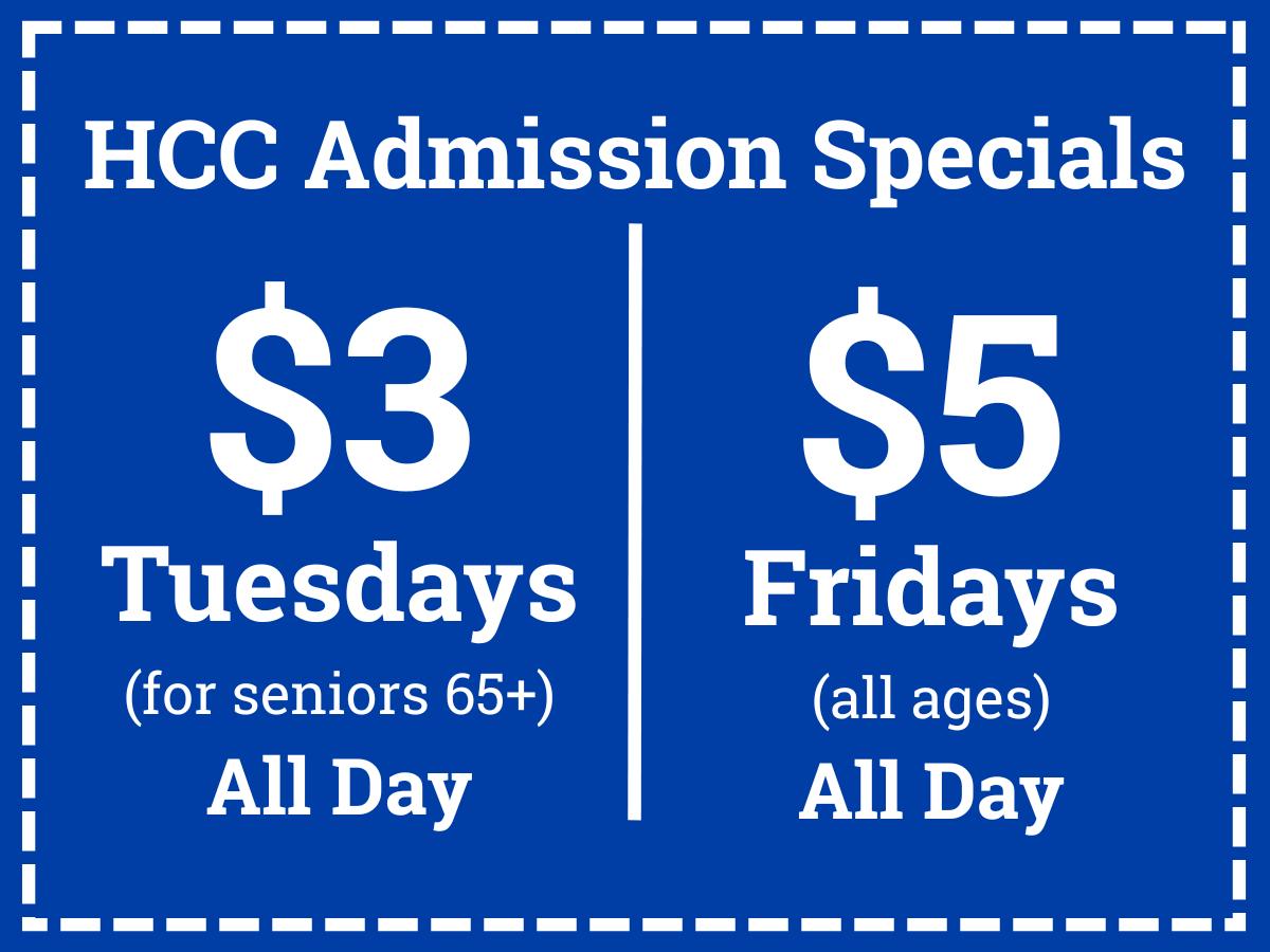 Tuesdays & Wednesdays 6:45 - 8:45pm Tuesdays, Thursdays, Fridays 11:30am-2:30pm (Tuesdays $3 admission for 65+, Fridays $5 admission)