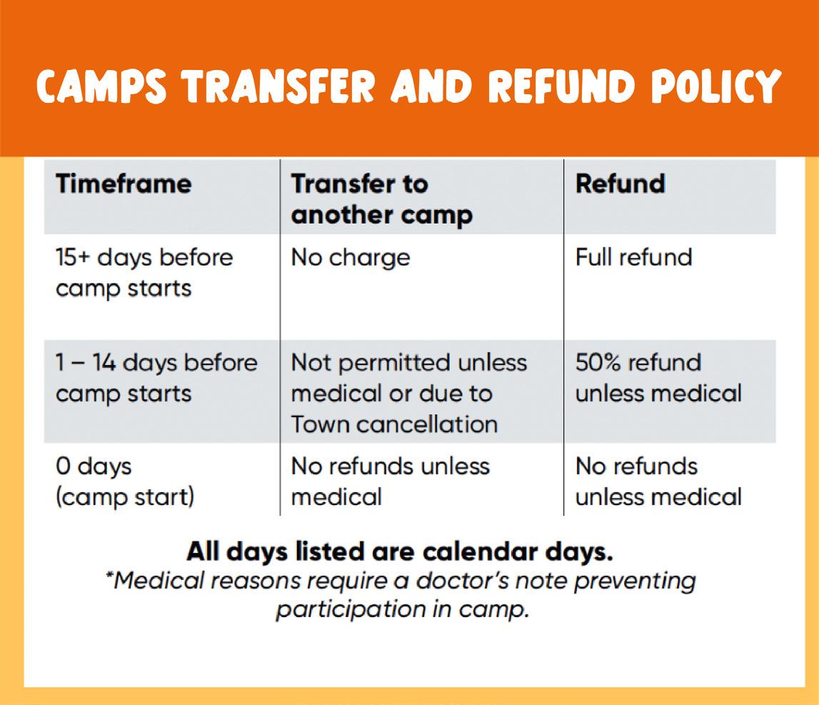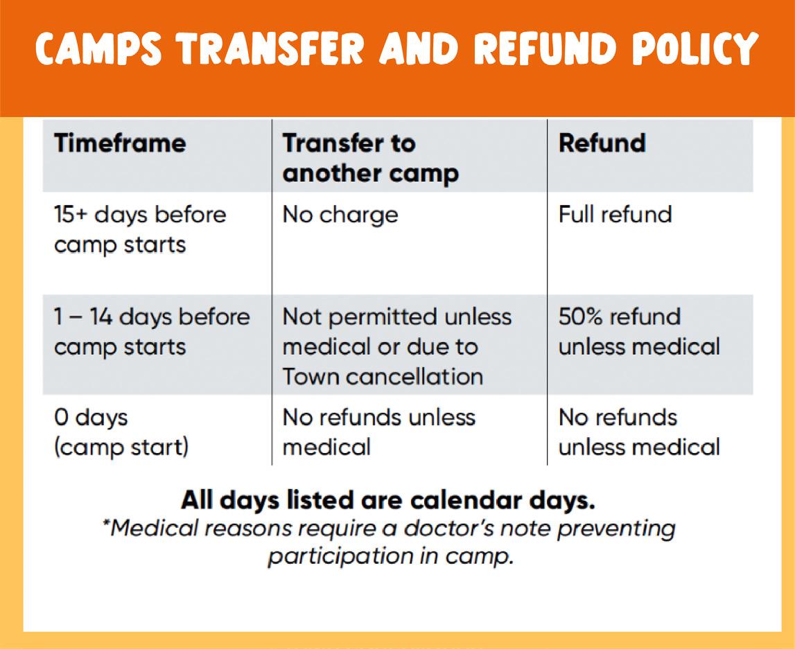 1 – 14 days before camp starts Not permitted unless medical or due to Town cancellation 50% refund unless medical
