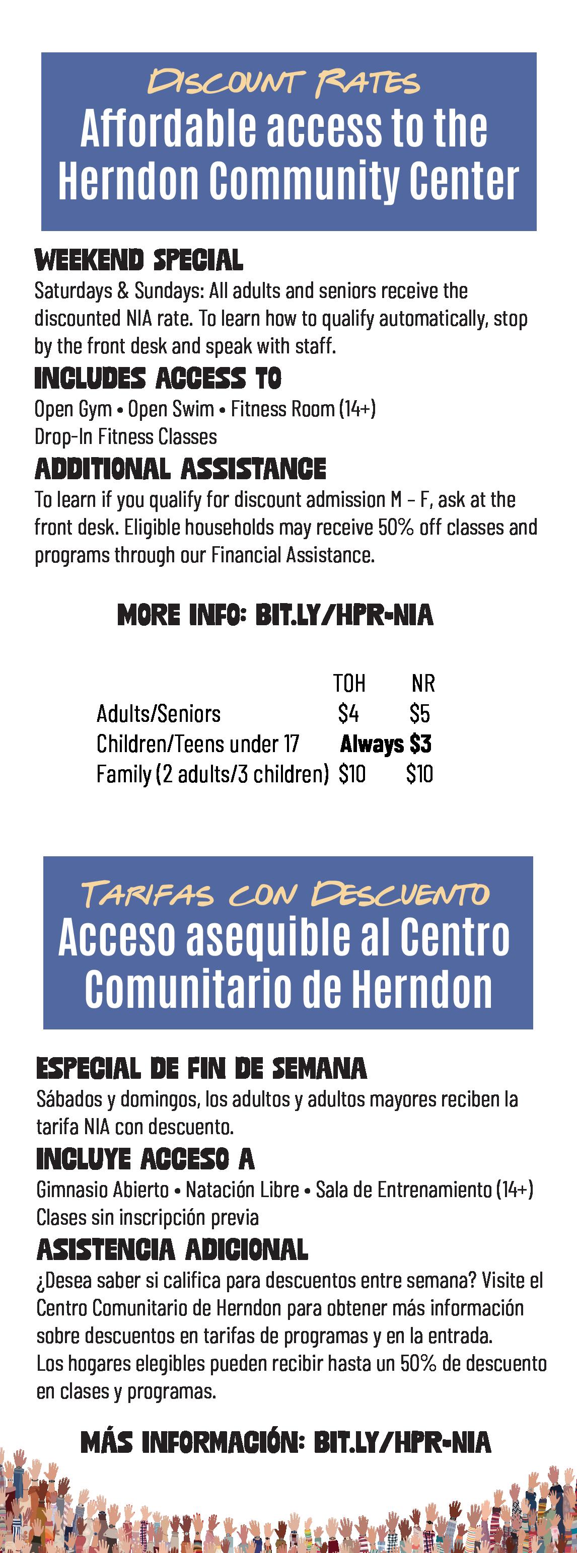 TOH = Town of Herndon Resident (Requires ID with address); NR = Non-Resident; Youth: 17 & under, Student: 18-25 with student ID, Senior: 65+