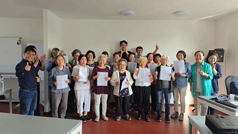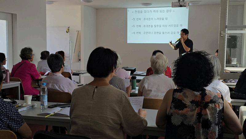 75세이상어르신들을위한제2기휴대전화강좌가 8 월 1일부터진행되었다 교육내용은전원켜고끄기, 전화사용및번호저장, 진동및무음모드설정, 볼륨 조절, 화면밝기및글자크기조절, 문자와구글번역, 이메일및지도앱사용, 카카오톡기본기능등으로구 성되었다 높은관심으로대기자가 15명에달했고, 이 들은 11월에있을추가교육에서우선적으로수강할기 회를갖게된다 8월 22일수료식에서는참가자들이각 자준비한음식을나누며서로를축하했다. 이번강좌 는디지털장벽을허물며, 나이에상관없이배움이가 능함을보여준의미있는시간이었다