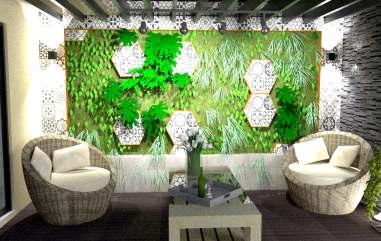 Los materiales y acabados propuestos dan una imagen sosticada y elegante a la terraza, asi mismo se integra con la paleta de colores de la vivienda. El uso de follaje articial y pasto sintético dan al espacio la ventaja de tener cero mantenimiento.