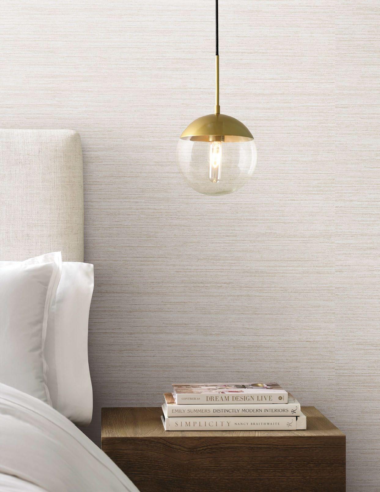 This fabric-inspired wallpaper features subtle striping and a texture that is reminiscent of loomed linen.