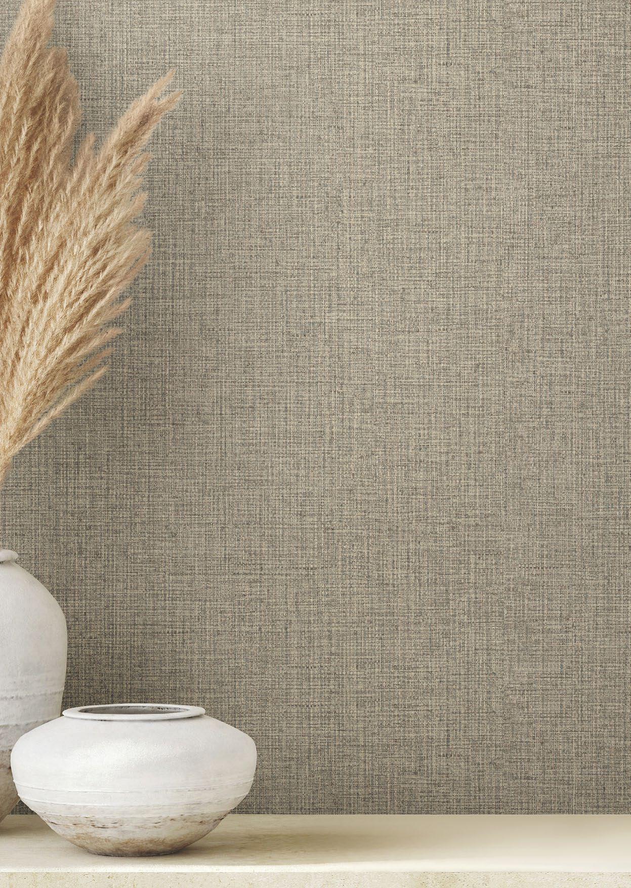 A fine, tightly loomed basketweave gives this faux fabric wallpaper both visual and tactile texture.