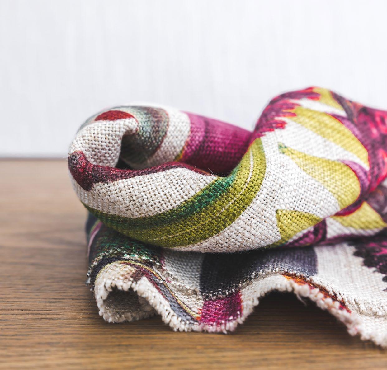 This group of diverse designs features conversational pieces. Bo-Kaap, which is printed on a 280cm-wide viscose-linen base, comes in three colourways and pays tribute to Cape Town’s historic Malay quarter, known for its colourful homes, welcoming people and spicy cuisine. Tulbagh too has an air of the past, with a floral display of local flora in a distinctly Cape Dutch-type vase.