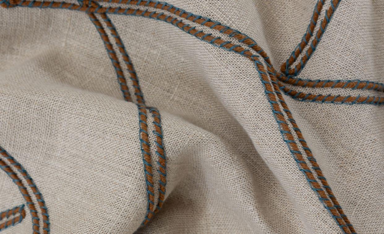 Full width: 139cm. Embroidered width: 135cm. Base: 55% linen, 45% cotton. Face: 85% acrylic, 15% polyester. Down-the-roll pattern. Suitable for curtaining and decorative accessories. Dye-lot variations may occur.