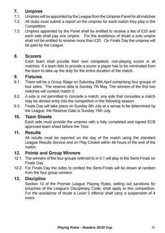 7.1. Umpires will be appointed by the League from the Umpires Panel for all matches 7.2. All clubs must submit a report on the umpires for each match they play in the Competition 7.3. Umpires appointed by the Panel shall be entitled to receive a fee of £25 and each side shall pay one umpire. For the avoidance of doubt a sole umpire shall not be entitled to receive more than £25. On Finals Day the umpires will be paid by the League.