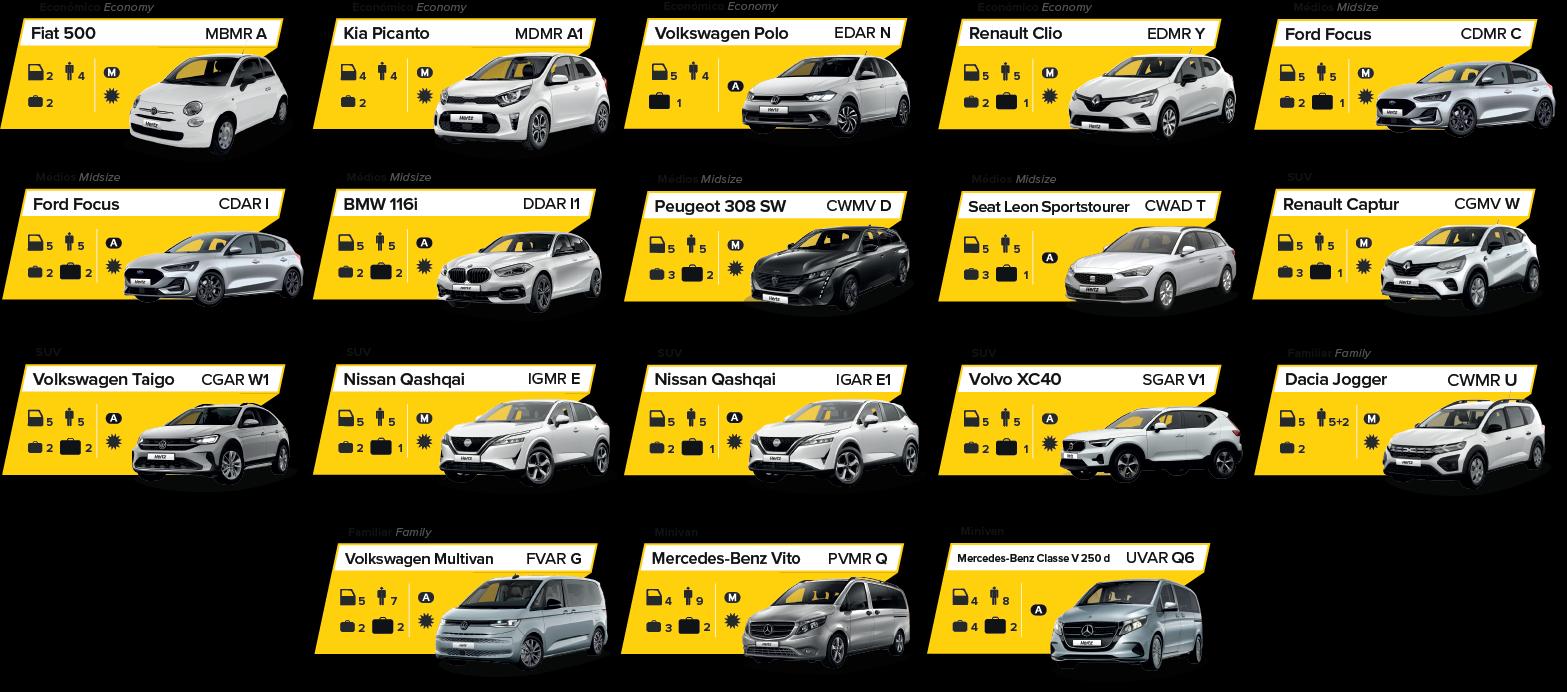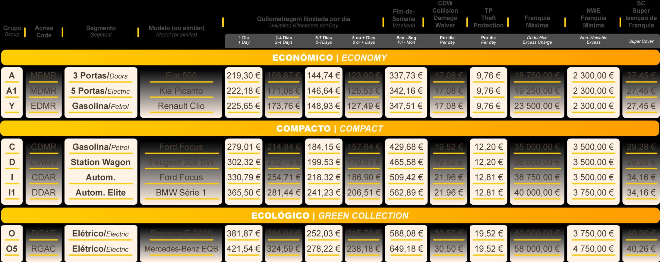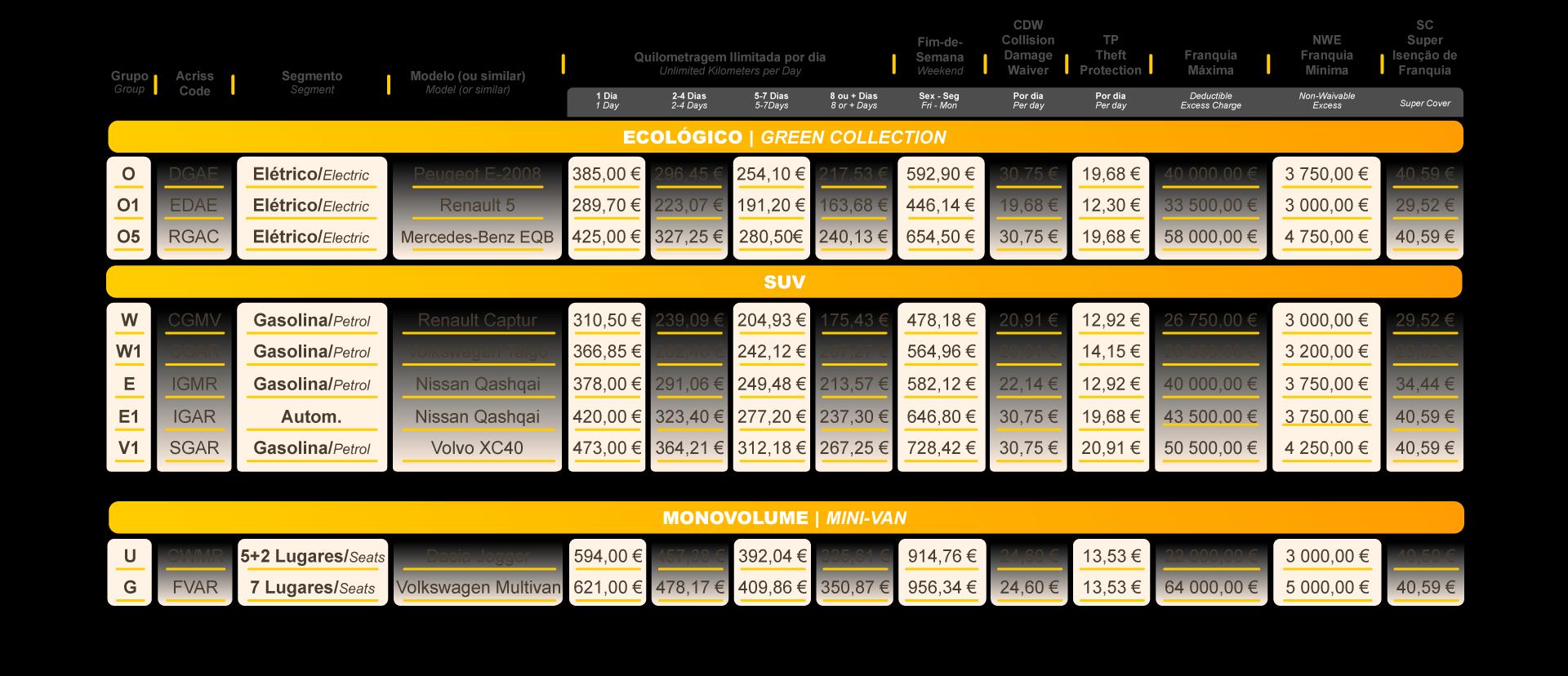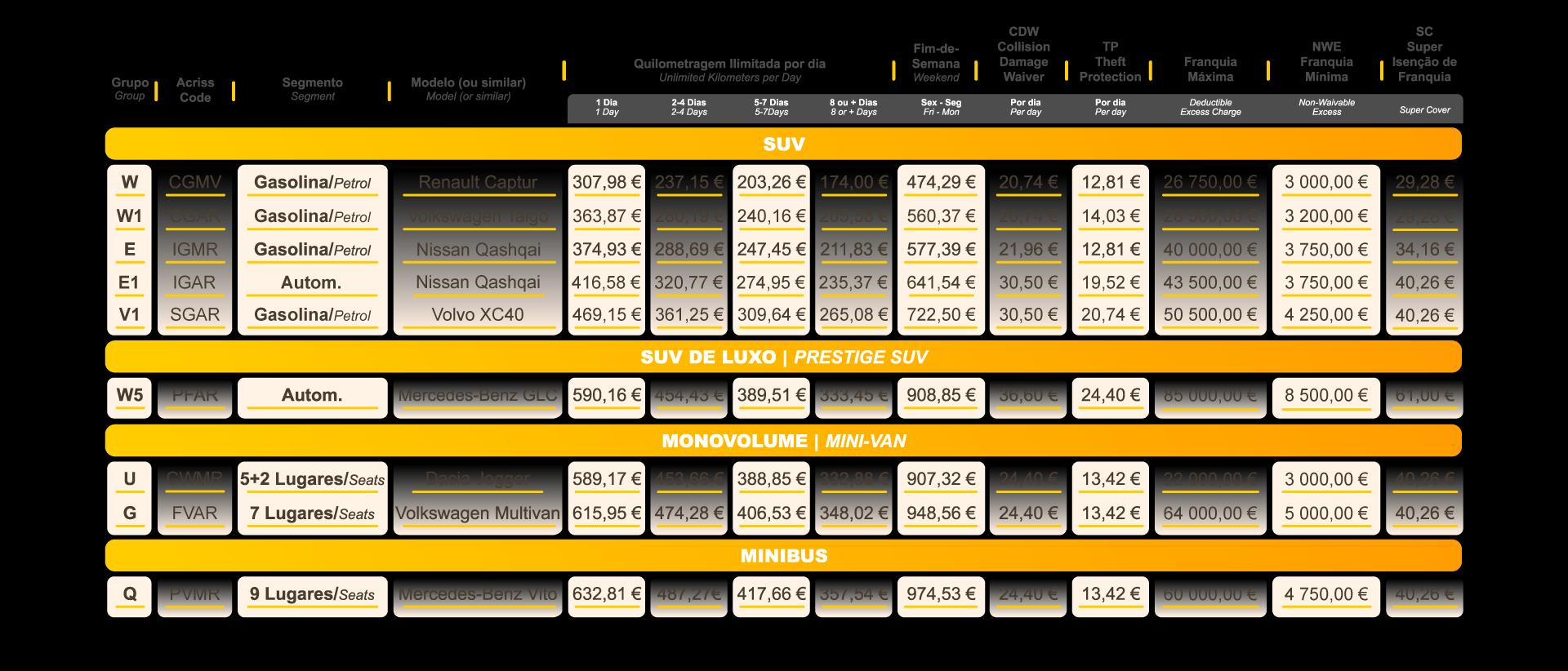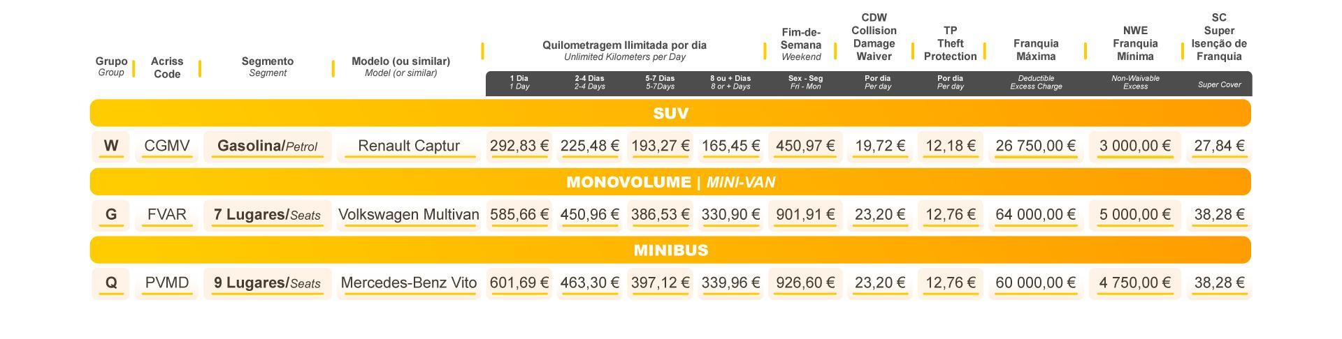 NOTE: All prices include VAT at the legal rate in force, Limited Public Liability cover of 50.000.000,00€, Full Maintenance of the Vehicle, Road Maps and 24 hours Road Assistance. HR-Aluguer de automóveis, S.A. will not be responsible for any expenses associated with the vehicle’s apprehension by the authorities during the transport of illegal merchandise, including expenses from its immobilisation The client will be fully responsible for the before mentioned expenses