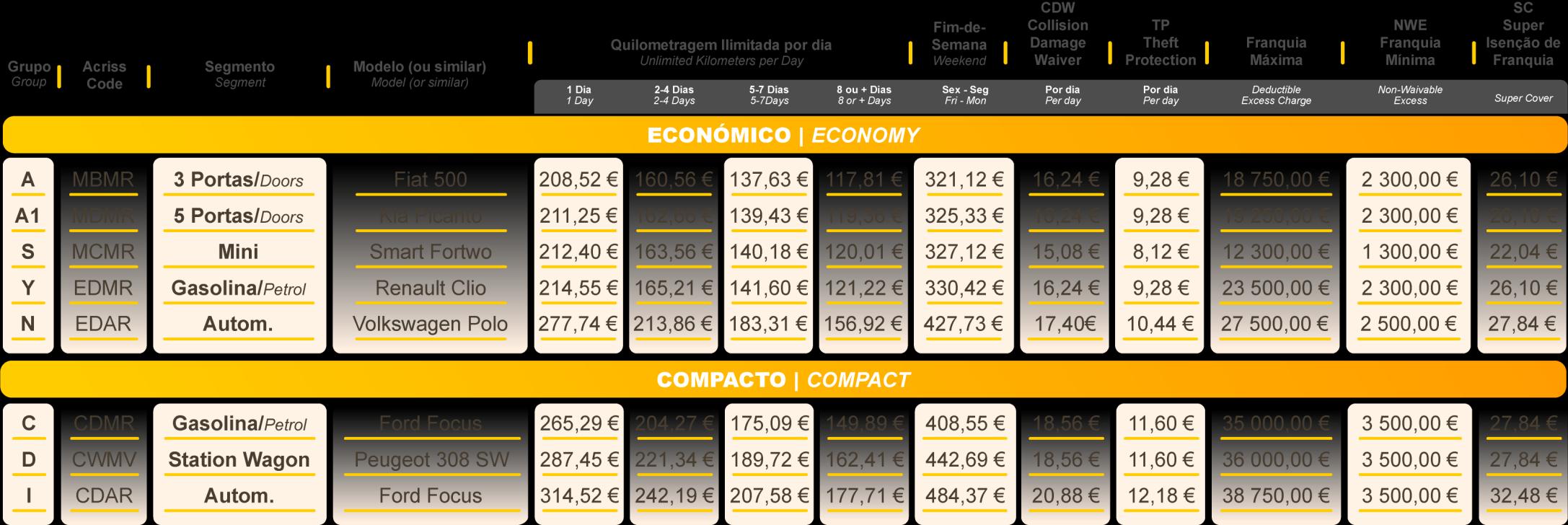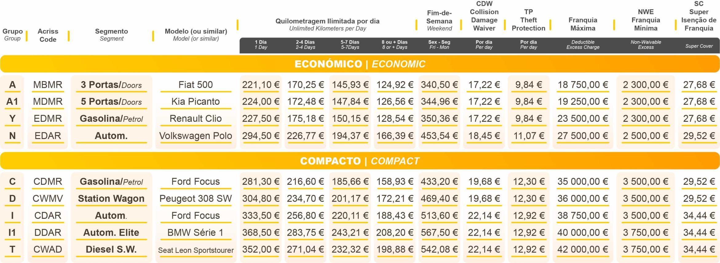 Mandatory for Prestige fleet. For remaining car groups, the client is the one responsible until the value of the Non Waivable Excess (NWE) in case of the complete or partial theft of the vehicle, by accepting an additional daily fee (see TP chart on National Tariff –pages 6 to 8).