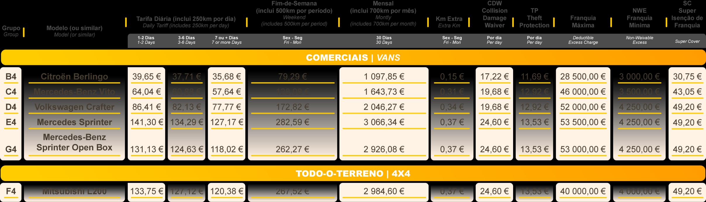 NOTA: Todos os preços incluem IVA à taxa legal em vigor, Seguro de Responsabilidade Civil Limitado de 50 000 000,00€, Manutenção, Lubrificantes, Mapas de Estrada e Assistência em Viagem 24 horas Todas as despesas, incluindo as inerentes à imobilização da viatura, quando a mesma for apreendida pelas autoridades policiais na decorrência do transporte ilegal de mercadorias, serão da total responsabilidade do alugador e não da HR –Aluguer de Automóveis S.A.