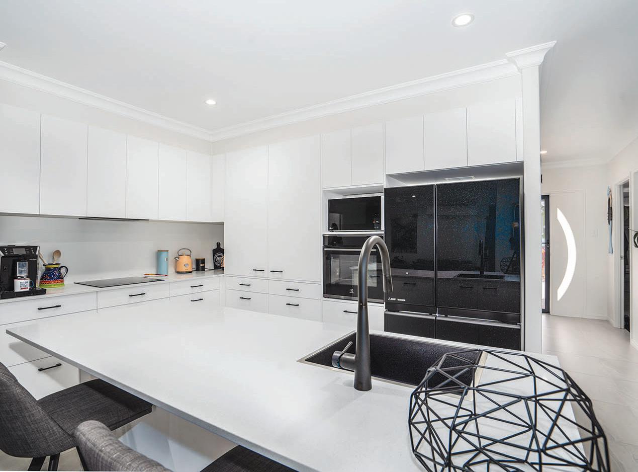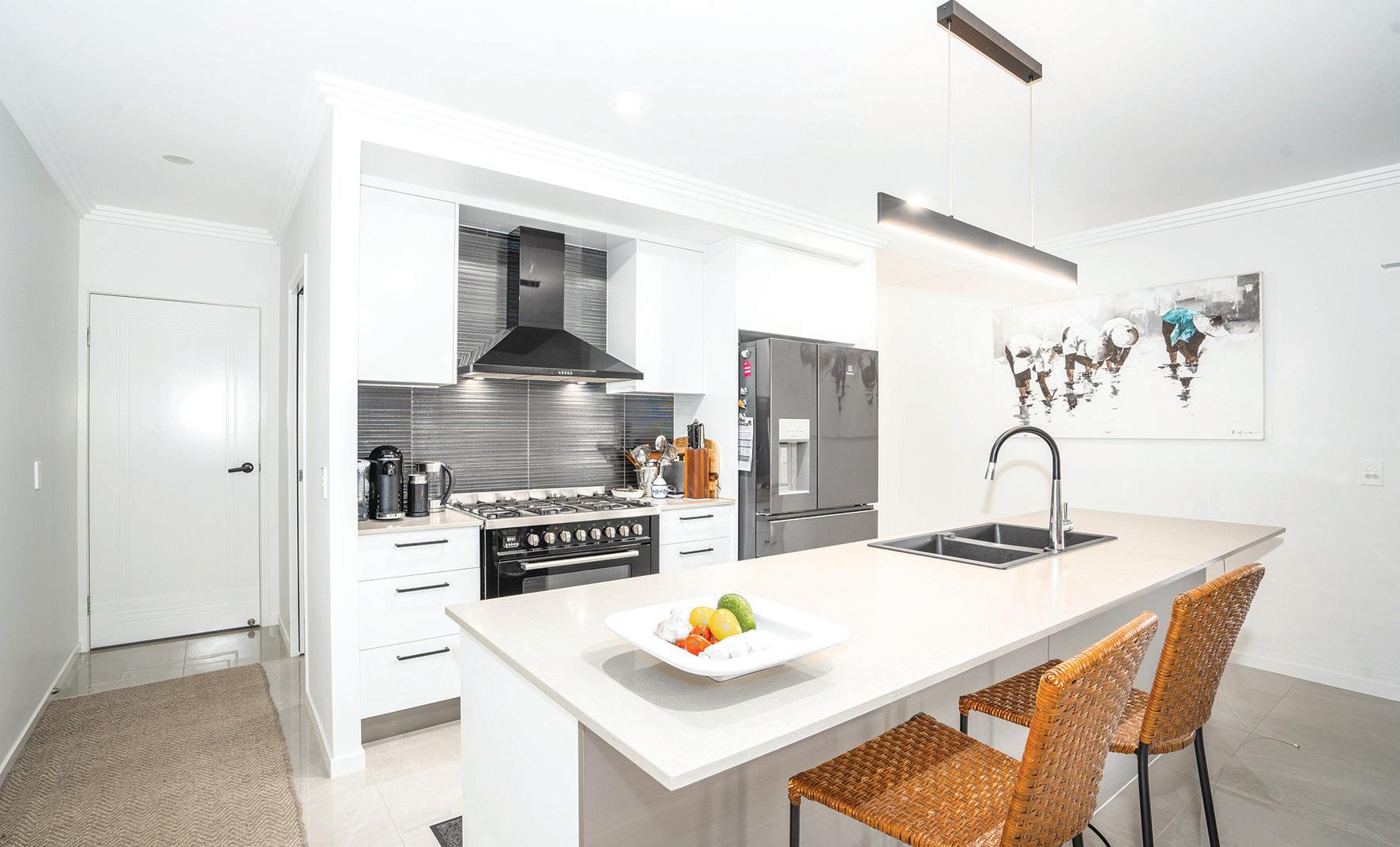Gourmet kitchen with stone bench tops, glass splash backs and quality appliances.
