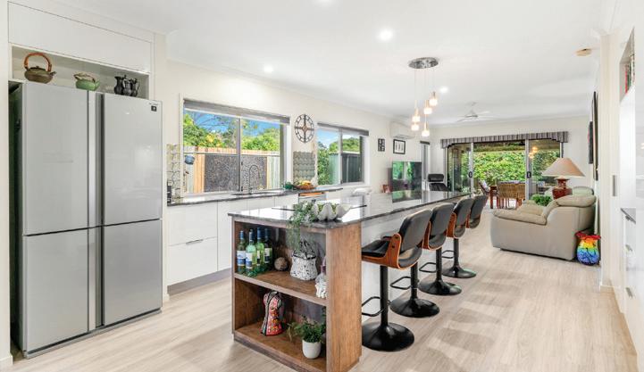The inviting allure of a recently renovated modern kitchen, overlooks the promise of adventure as the spacious entertainment area beckons you to unwind