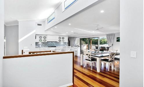 The beautiful entry creates a wow factor with an impressive introduction and leads to an elegant contemporary open-plan design. The main living area and kitchen open onto the entertaining deck and dining area overlooking a glorious water outlook.