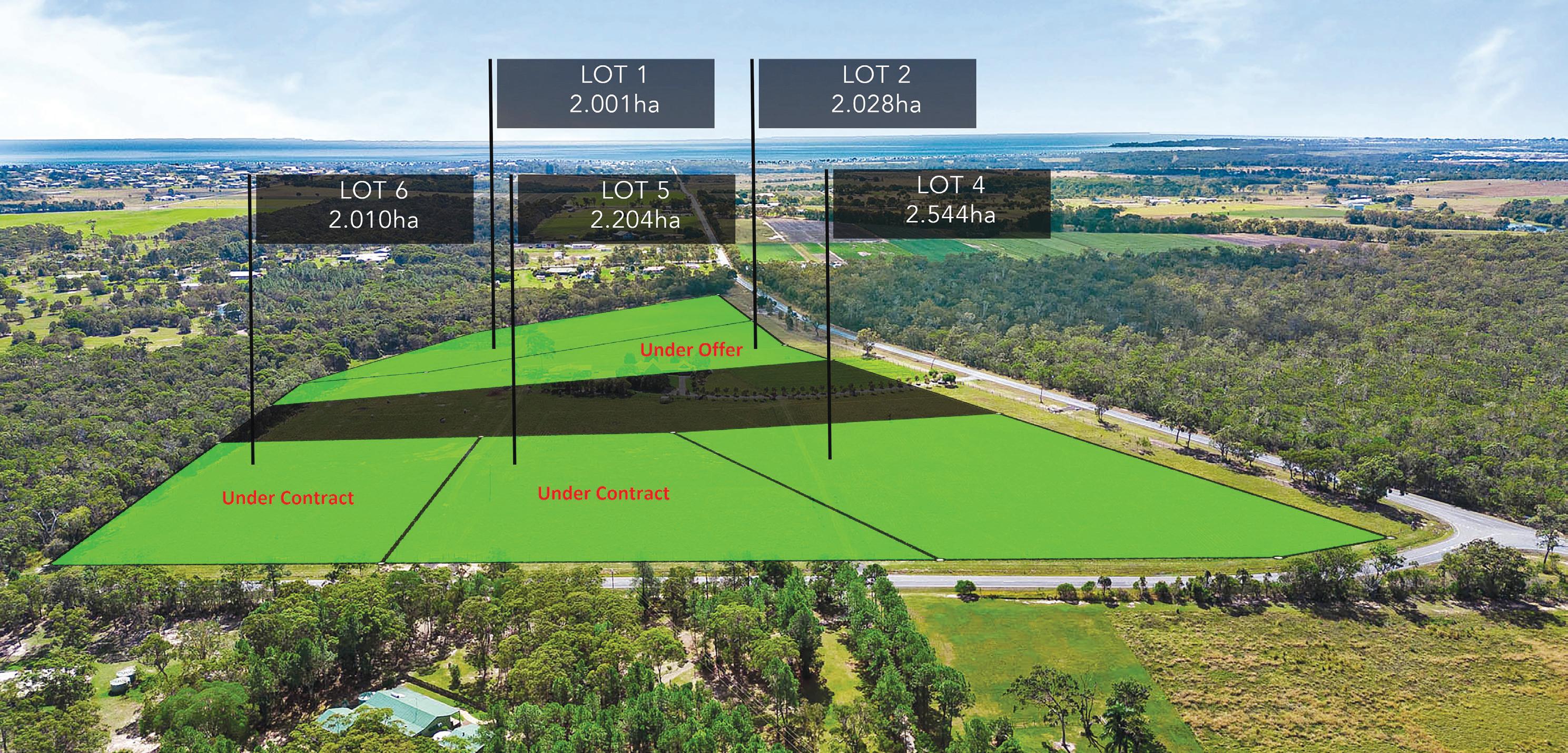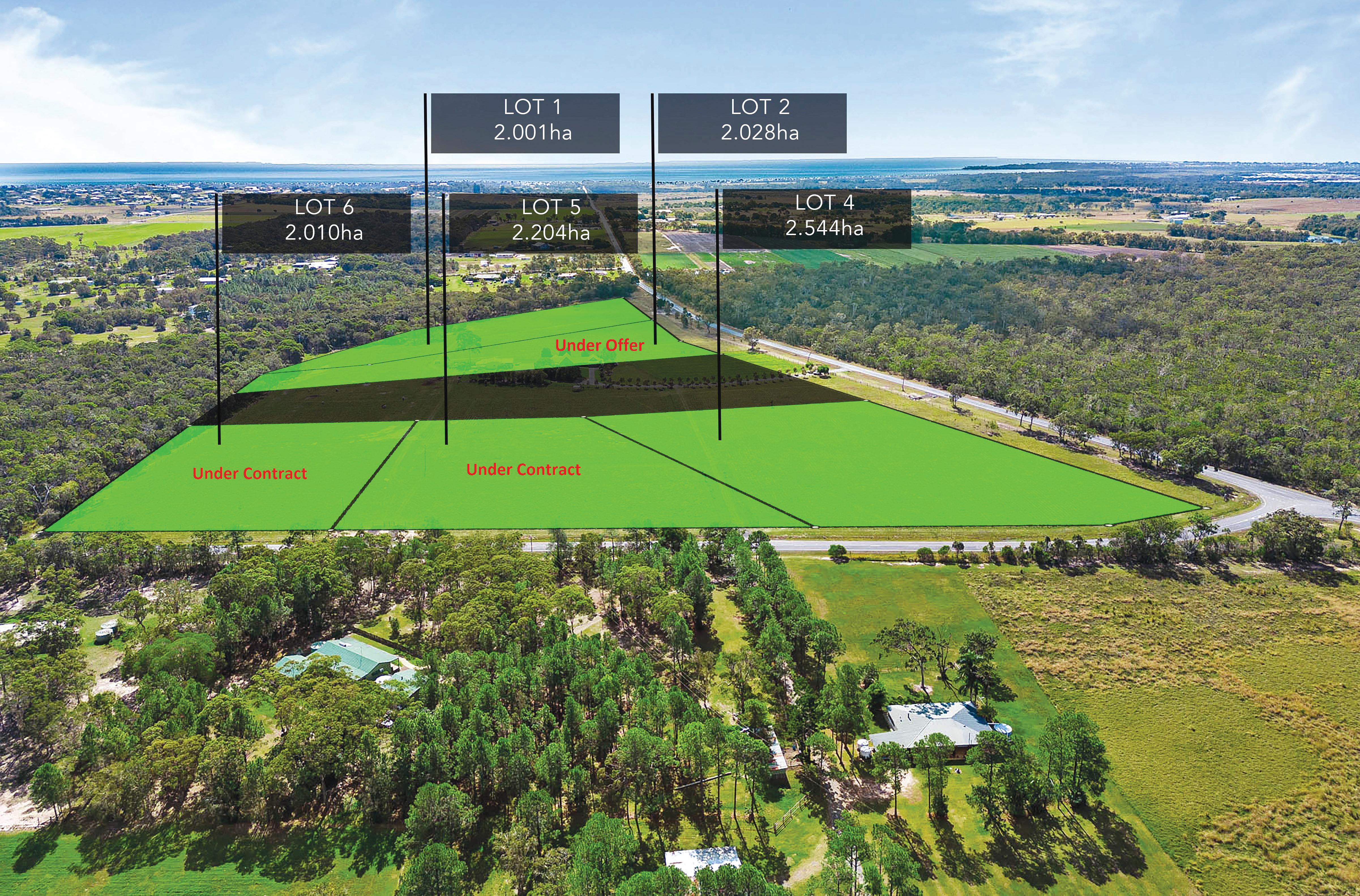 Lot 2 Dundowran Road: 2.028ha/5.01 acres. An Easterly aspect with wide frontage. A good dam site (STCA) at the back of the block. Best block for horses. UNDER OFFER