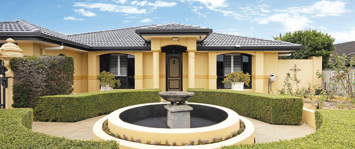Four spacious bedrooms, the large master suite is an opulent sanctuary featuring a luxe modern ensuite and walk-in robe, while the three additional rooms and study cater to the family or guests. A tranquil space for entertaining, the resort-style outdoor living features an undercover alfresco pavilion and a sparkling inground pool with spa and solar heating for all-season swimming surrounded by beautiful gardens, creating a tropical ambience.