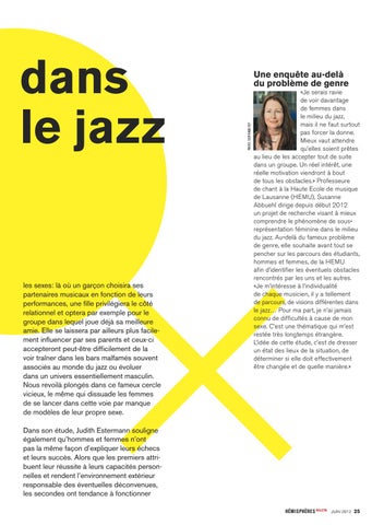 Une enquête au-delà du problème de genre «Je serais ravie de voir davantage de femmes dans le milieu du jazz, mais il ne faut surtout pas forcer la donne. Mieux vaut attendre qu’elles soient prêtes au lieu de les accepter tout de suite dans un groupe. Un réel intérêt, une réelle motivation viendront à bout de tous les obstacles.» Professeure de chant à la Haute Ecole de musique de Lausanne (HEMU), Susanne Abbuehl dirige depuis début 2012 un projet de recherche visant à mieux comprendre le phénomène de sousreprésentation féminine dans le milieu du jazz. Au-delà du fameux problème de genre, elle souhaite avant tout se pencher sur les parcours des étudiants, hommes et femmes, de la HEMU afin d’identifier les éventuels obstacles rencontrés par les uns et les autres. «Je m’intéresse à l’individualité de chaque musicien, il y a tellement de parcours, de visions différentes dans le jazz… Pour ma part, je n’ai jamais connu de difficultés à cause de mon sexe. C’est une thématique qui m’est restée très longtemps étrangère. L’idée de cette étude, c’est de dresser un état des lieux de la situation, de déterminer si elle doit effectivement être changée et de quelle manière.»