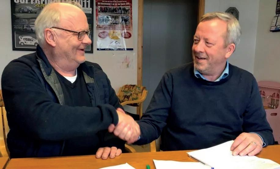 Her signerer styremedlem Oddmund Eggum (t.v.) i Trondenes Skytterlag avtalen med markeds- og arrangementsansvarlig Knut Ivar Mikalsen om å leie Harstad Travpark neste sommer.