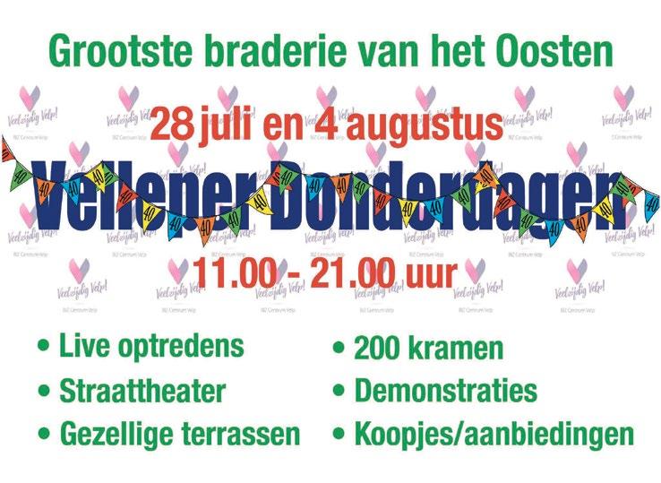 VELP - In Velp worden op donderdag 28 juli en donderdag 4 augustus de traditionele Velleper Donderdagen gehouden. Nadat het vanwege de pandemie twee jaar niet mogelijk was om deze speciale, veertigste editie te organiseren, staat deze zomer een feestelijke uitgave van het grootste braderie van het oosten op het programma. De braderie is beide dagen geopend van 11.00 tot 21.00 uur.