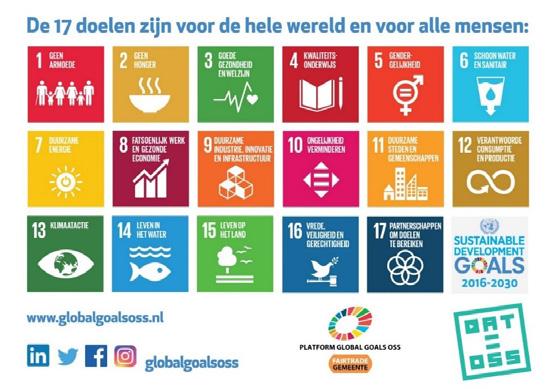 Oss is naast Fairtrade- ook Global Goals gemeente. Door u in te zetten voor de doelstellingen en activiteiten van Fairtrade, draagt u bij aan 10 van de 17 Global Goals!