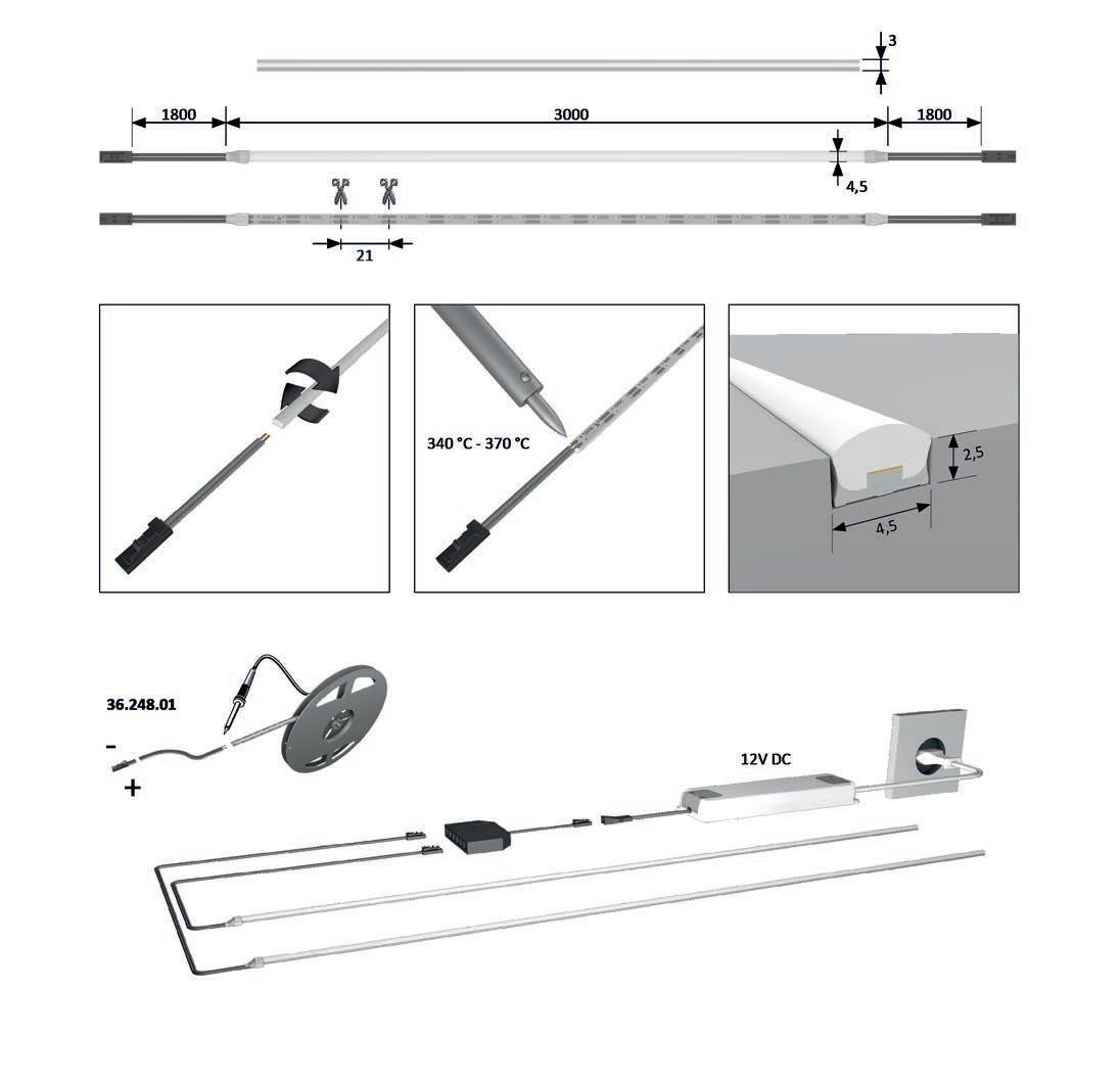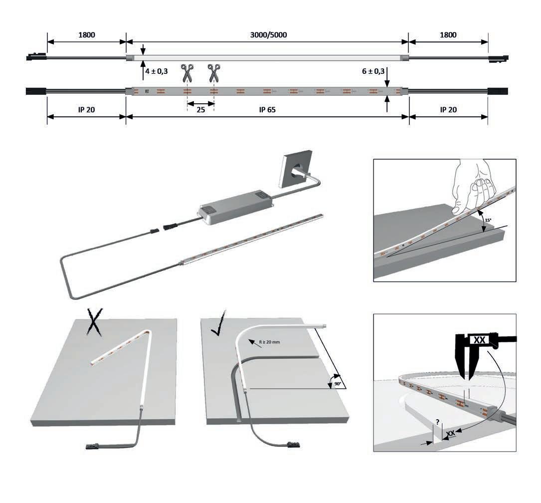The light emission of LED generates a certain amount of heat, which is however is so low (compared to other technical appliances) that it has almost no impact on the environment. The design of the light ensures that under normal conditions of use no heat accumulation will occur that reduces the life of the electronic components and the LED in particular. When using high-powered LED flex strips, the mounting surface must be able to dissipate some of the heat. We therefore recommend the use of ChannelLine profiles made of aluminium that act as heat sinks for LED light strips.