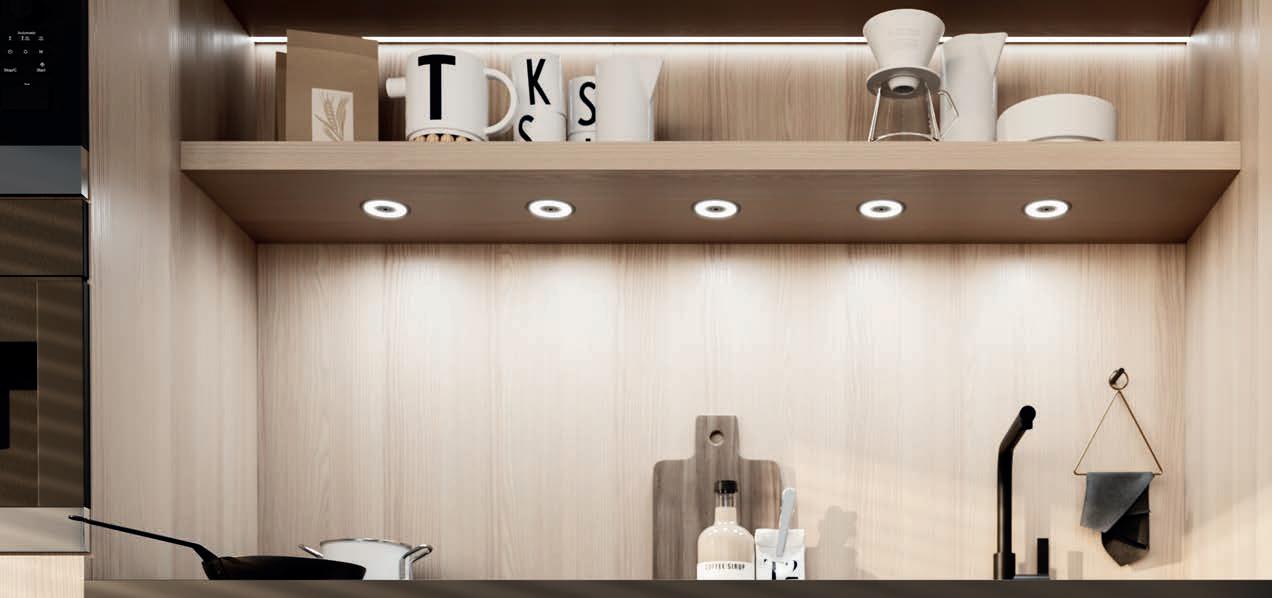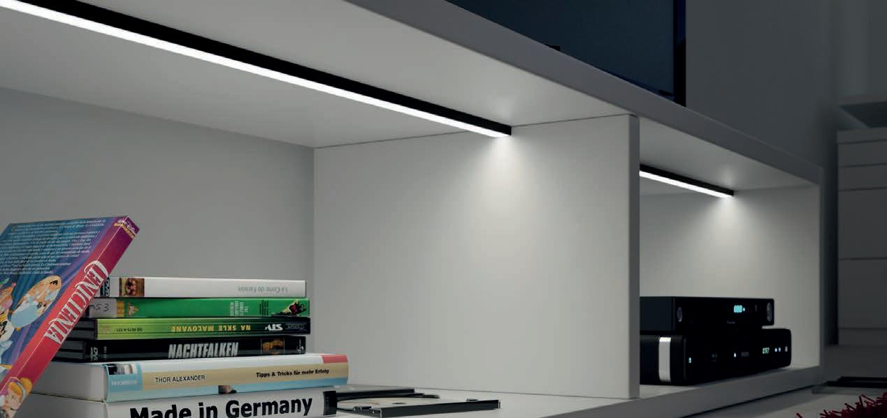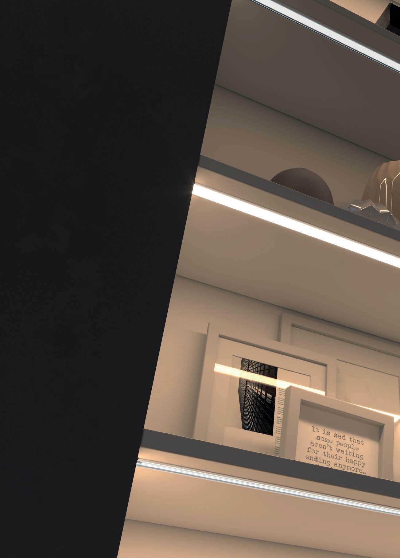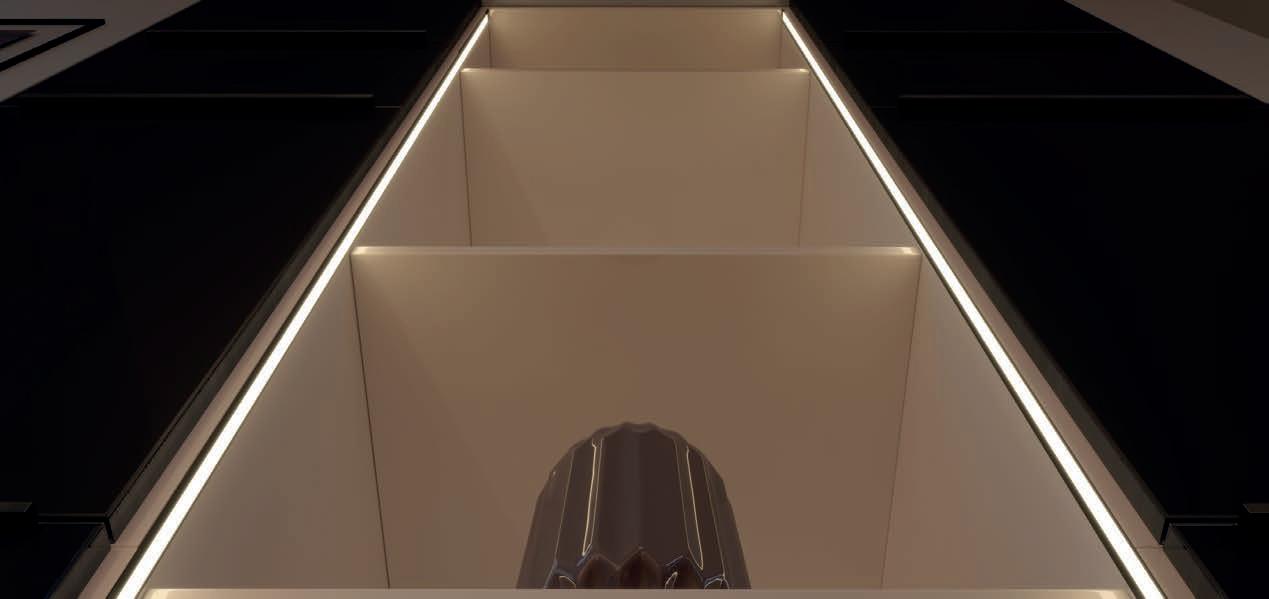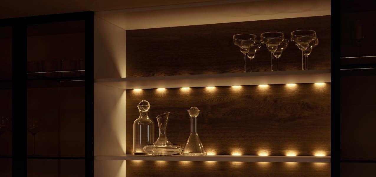 Our magic range utilises 12-volt lighting for furniture applications. This lower voltage allows for smaller light segments that can be elegantly concealed within furniture or profiles and create less shadow compared to 24 volts. With 12-volt lighting, you can effectively highlight cabinets, shelves, and display cases without worrying about the size of the transformers and cable management.