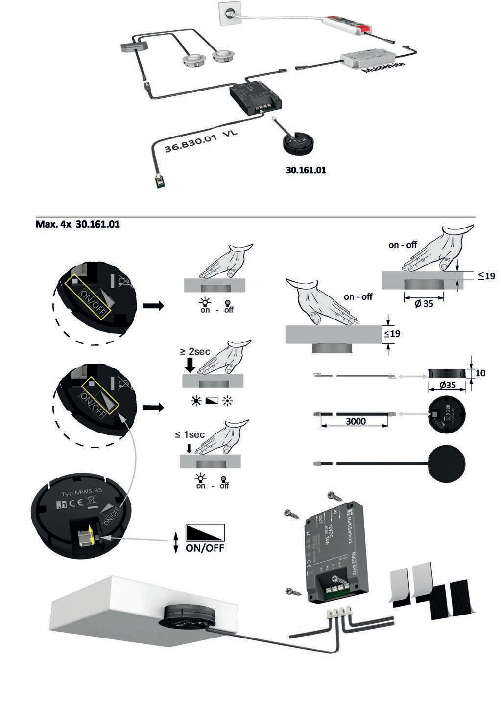 When using IR sensors, such as in combination with the Multiswitch or the integrated sensor of InnoLine, make sure that the infrared beam is reflected cleanly to the receiver. High gloss but also too strongly frosted surfaces and incorrect mounting distances can lead here to errors. Please use the reflector stickers supplied.
