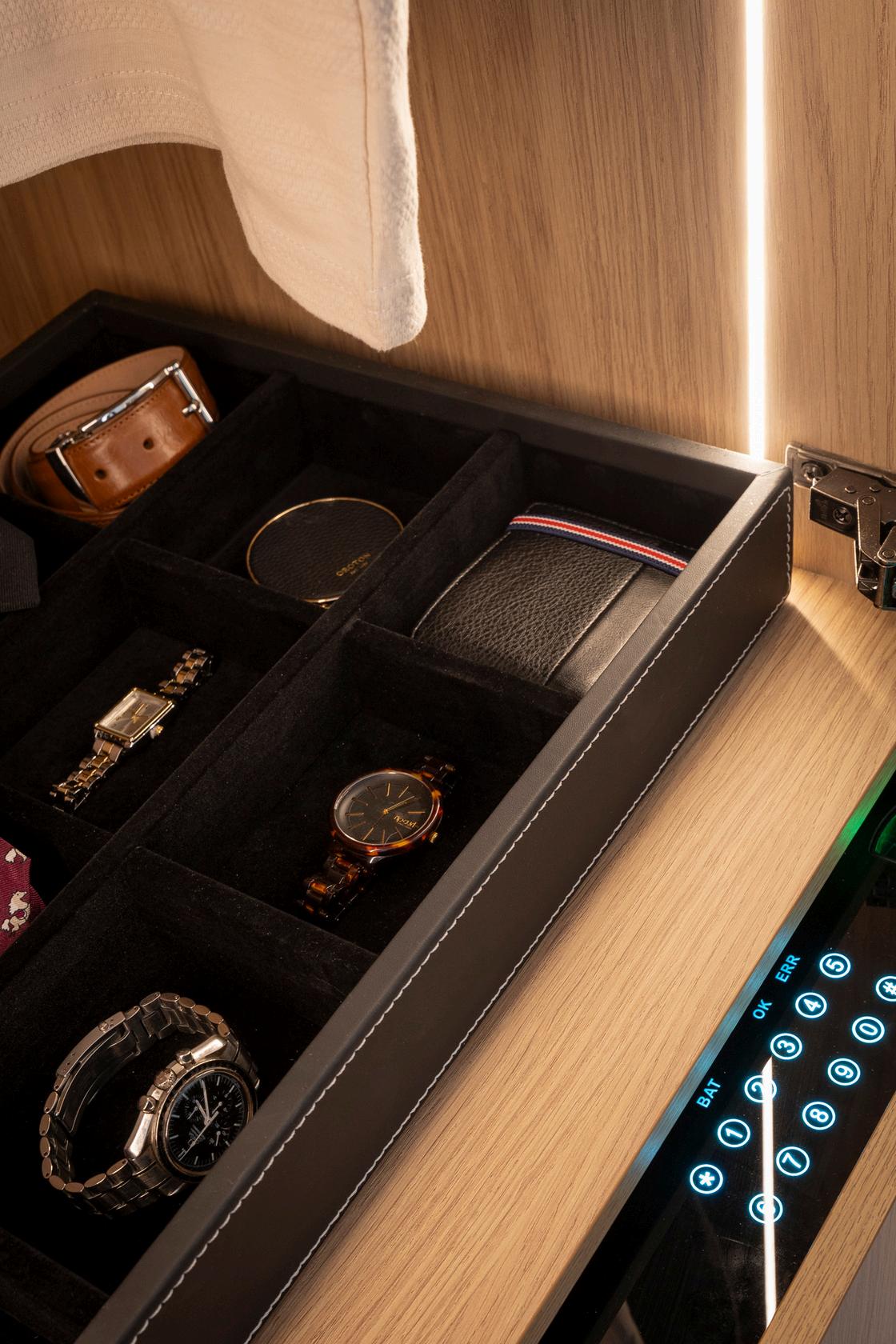 Darktimbersbringdepthandrichnesstothe scheme,whileintegratedilluminationhighlightsthe wardrobe’sdetailsandenhancesitsluxuriousfeel.