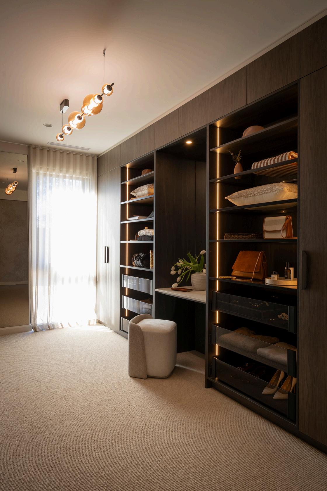 SonnyandAlicia’swalk-inwardrobeiscleverly concealedbehindasecretdoorinthebedroom, settingthetoneforapremiumandsophisticated space.Thedesignfocusesondrawerswithelegant glassinlaysratherthananexcessofcabinetry doors,complementedbyopenshelvingabovefor balanceandpracticality.