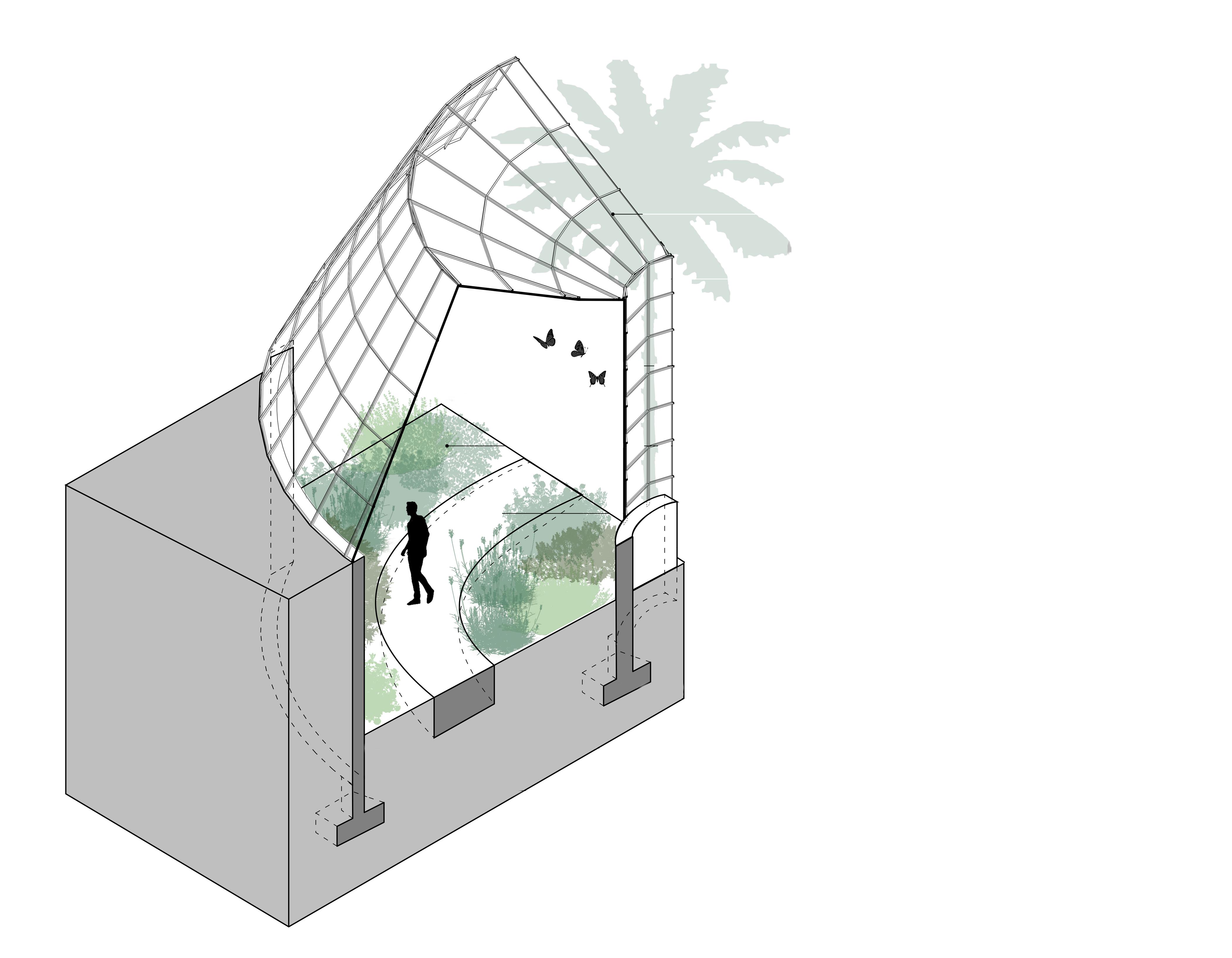 The Mediterranean rooftop has been divided into two sections to accommodate an important pathway and provide just the right amount of light for the shrublands below. The butterfly pavilion maintains its cone shape, offering ample space for the butterflies to fly freely. The central tube anchors the structure and provides a shaded space for a palm tree to grow.