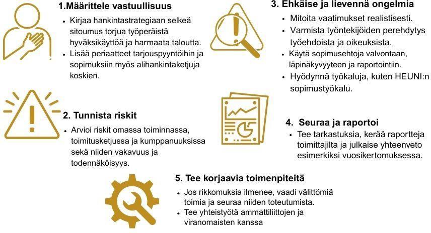 Kuva 1. Ihmisoikeuksien huolellisuusvelvoiteprosessi: viisi askelta vastuullisiin hankintoihin.