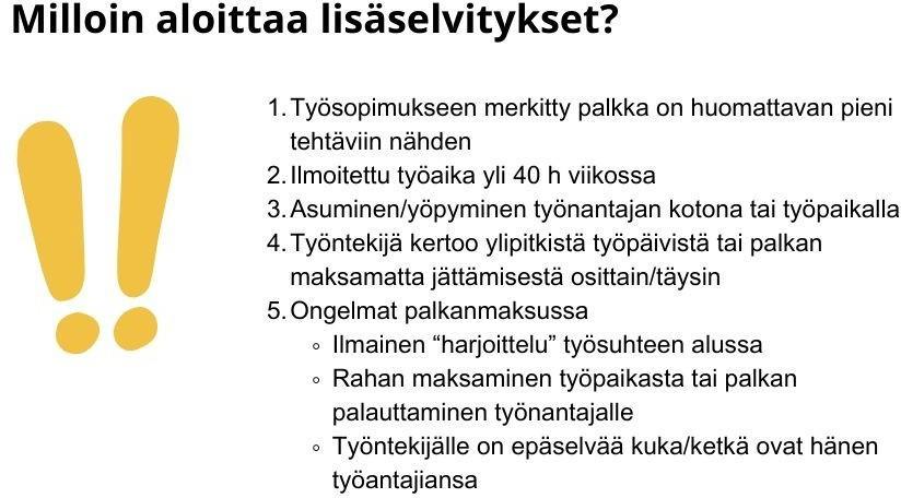 • Kysy neuvoaitsellesi jaohjeistatyöntekijääkysymään neuvoahyväksikäytön uhreja auttavilta tahoilta kuten Rikosuhripäivystykseltä, Ihmiskaupan auttamisjärjestelmältä, SAK työsuhdeneuvonnasta tai työsuojeluviranomaiselta.