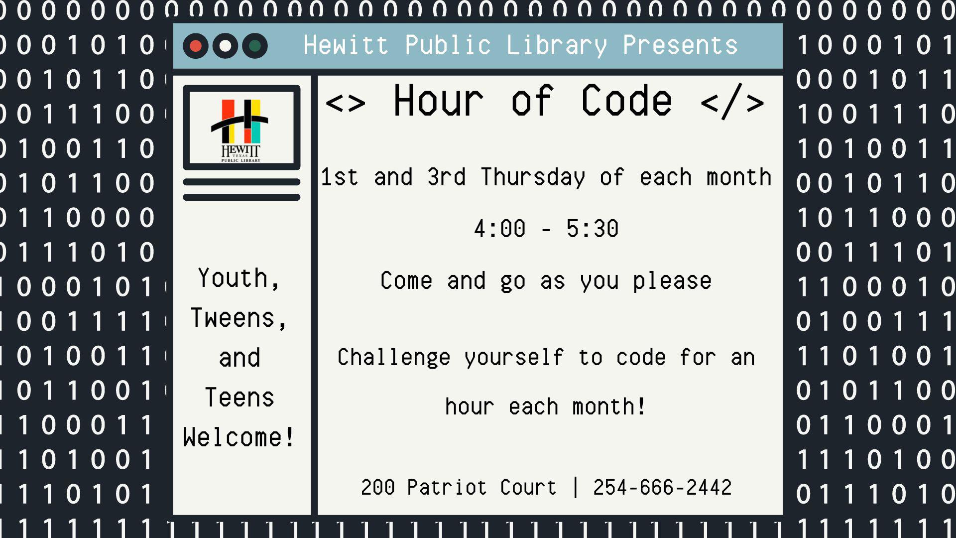 Are you interested in learning how to code? Or do you want to level up your coding skills? Join us for Hour of Code, and challenge yourself to code for one hour each month. First and Third Thursdays of the month from 4-5:30pm. This is a come-and-go program. Youth, Tweens, and Teens welcome