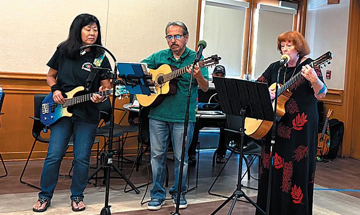 AUDIO TECH GROUP: Carrie Kumabe, Cesar Franco, and Susan McCormick of the Da’ Hawaii Seniors Club’s Audio Tech Group entertain fellow members with live music during the club’s March 26, 2026 meeting at the Cerritos Senior Center.
