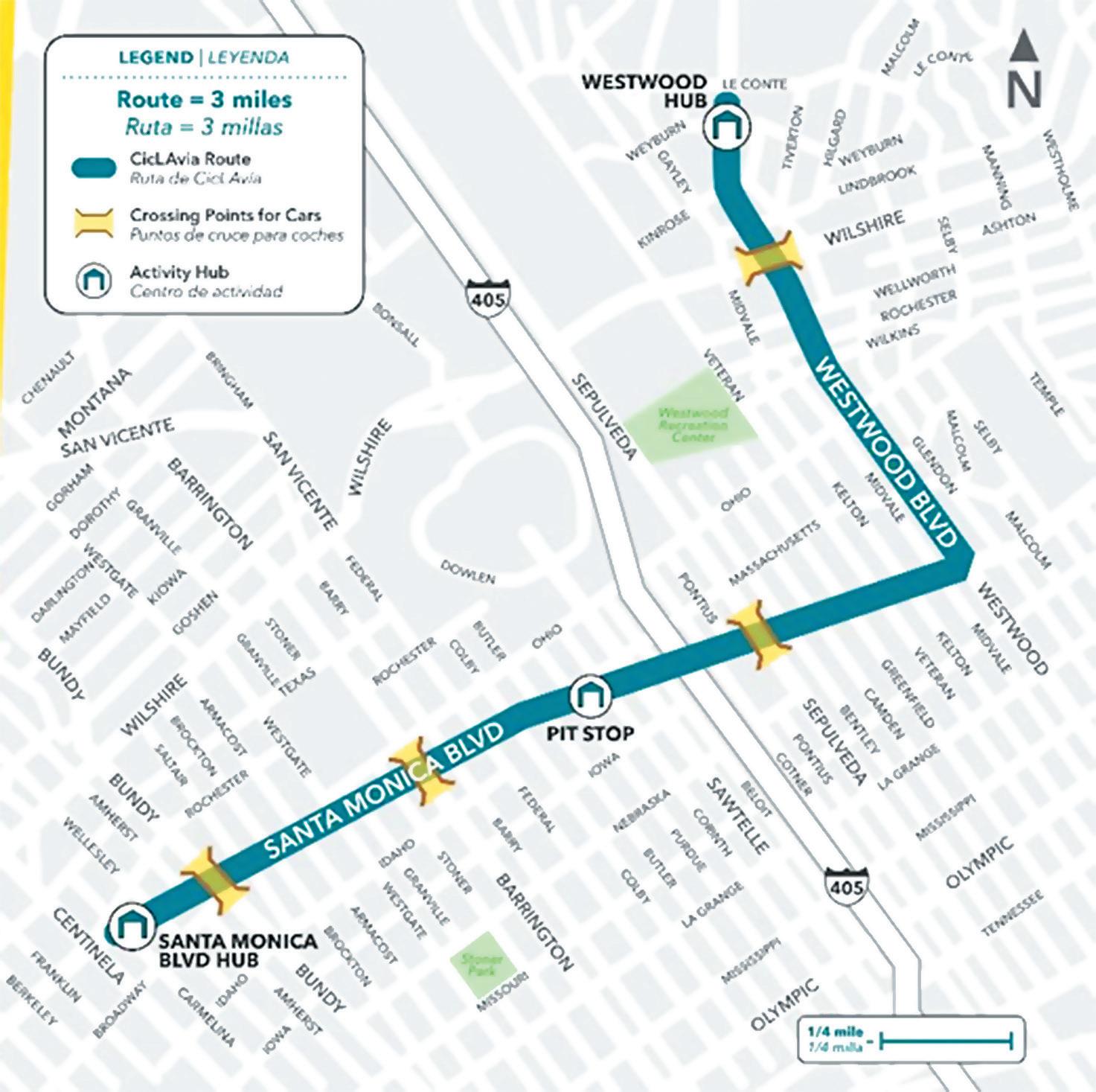 Two activity hubs will be set up along the route—one near Santa Monica Boulevard and Centinela, and another near Westwood Boulevard and Le Conte—offering rest areas, water