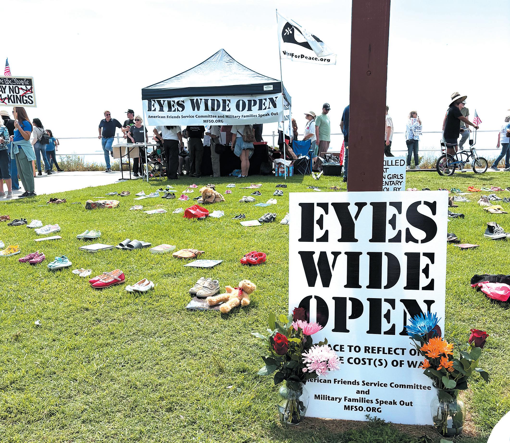 EYES WIDE OPEN: Shoes, toys, and personal items spread across Bluff Park in Long Beach formed a powerful memorial Saturday during a No Kings Day exhibit, symbolizing lives lost in war as visitors gathered to reflect and pay tribute. Photo courtesy Eyes Wide Open.