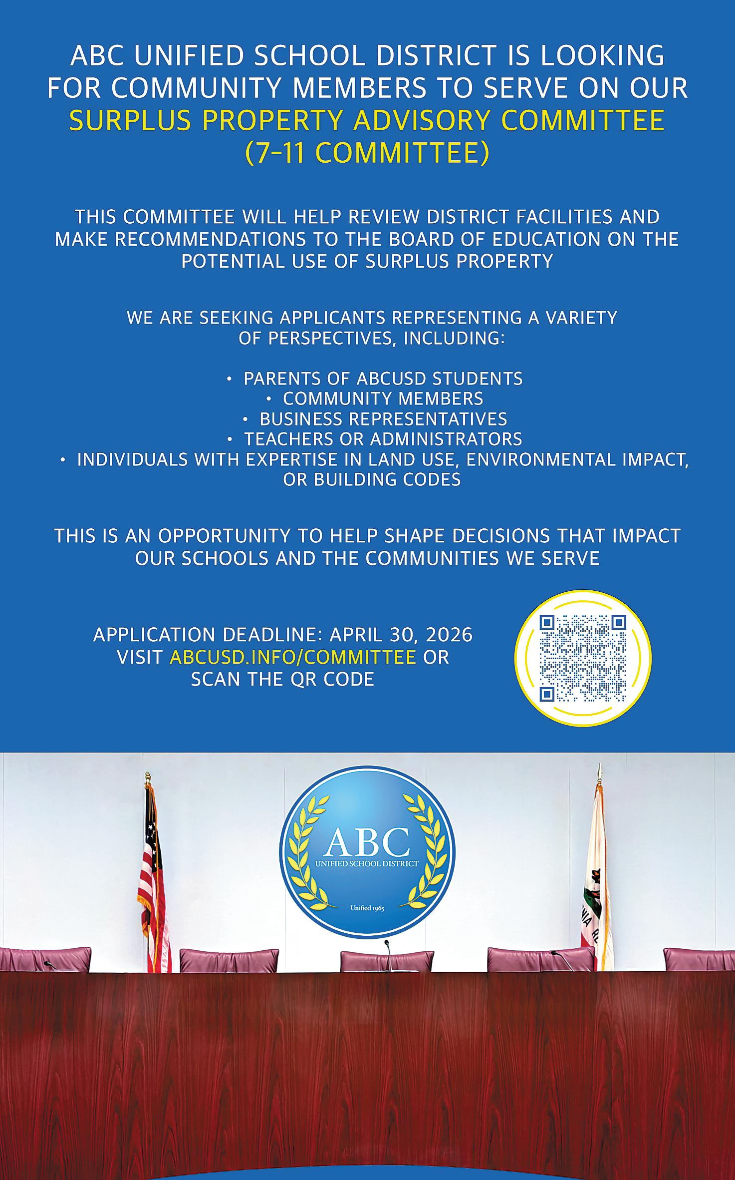 CERRITOS — ABC Unified is seeking residents for a Surplus Property Advisory Committee, or “7-11 Committee,” to evaluate unused school properties.