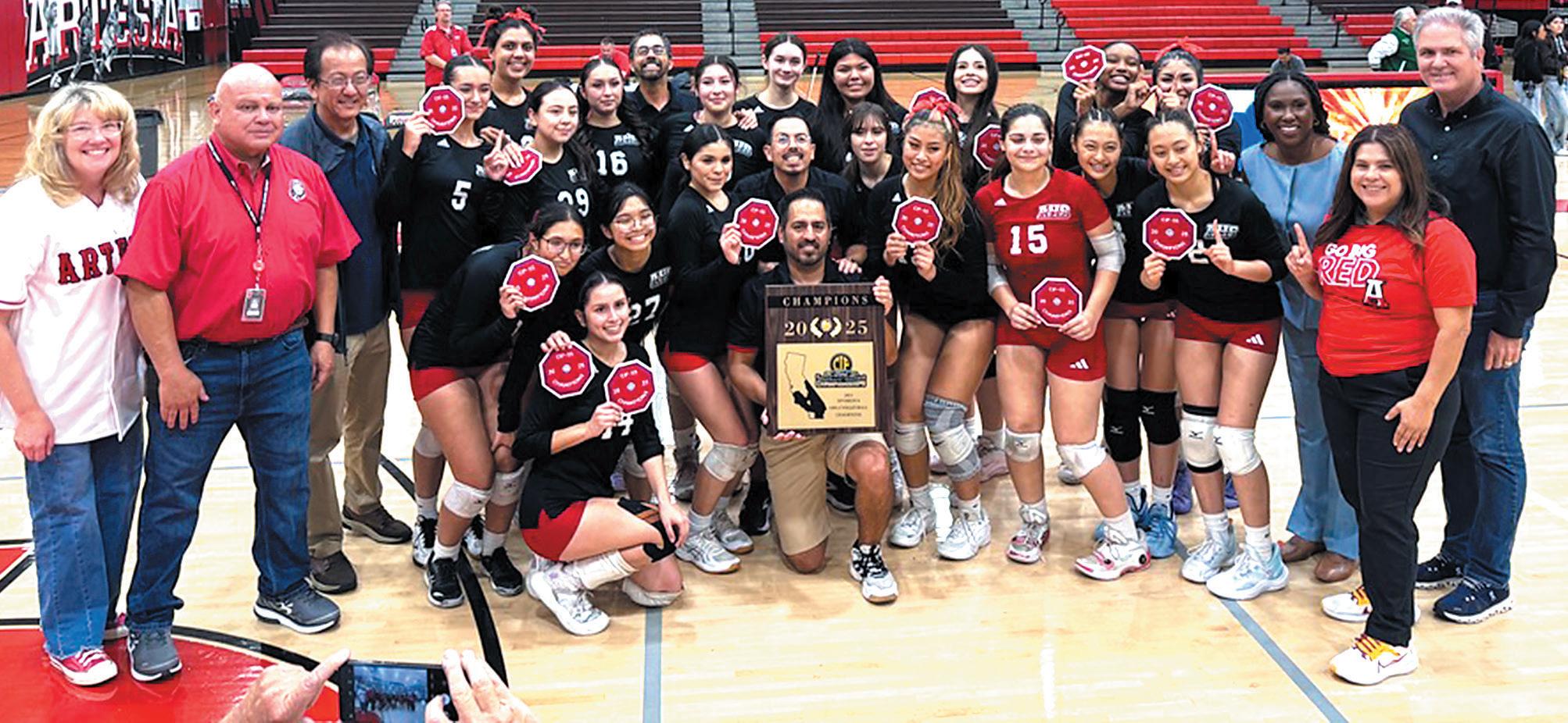 THE ARTESIA HIGH girls volleyball team celebrates the program’s first CIF-Southern Section divisional championship in school history. The Pioneers swept Schurr High 25-9, 25-12, 27-25 last Saturday night in the Division 8 finals. Seen with the team is ABCUSD Superintendent Gina Zietlow, Board President Ernie Nishii and Lakewood Councilman Jeff Wood and ABC Boardmember Dr. Olga Rios. Full story on page 10